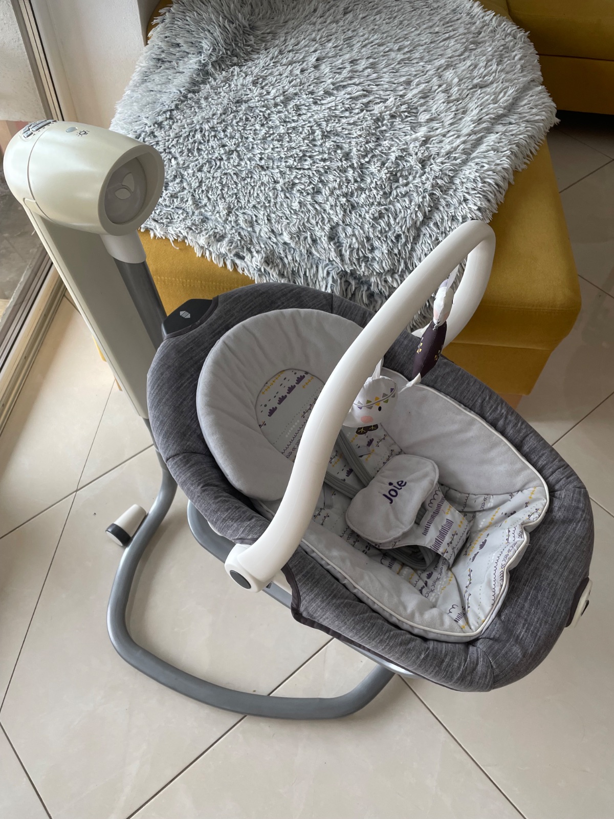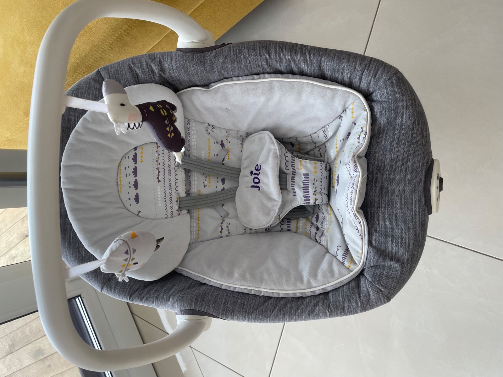 Hojdačka Joie pre babätká, dá sa nadstavovať do veľmi veľa polôh, úrovní a intenzity hojdania, má melódie a aj vibrovanie- to som ale nezistila ako sa zapina( možno nefunguje, brala som z druhej ruky). U nás používana veľmi máličko, ale dobre polúžila ak som potrebovala na pár minut niečo dorobiť ap. Cena 40€- už mi dosť zavadzia
