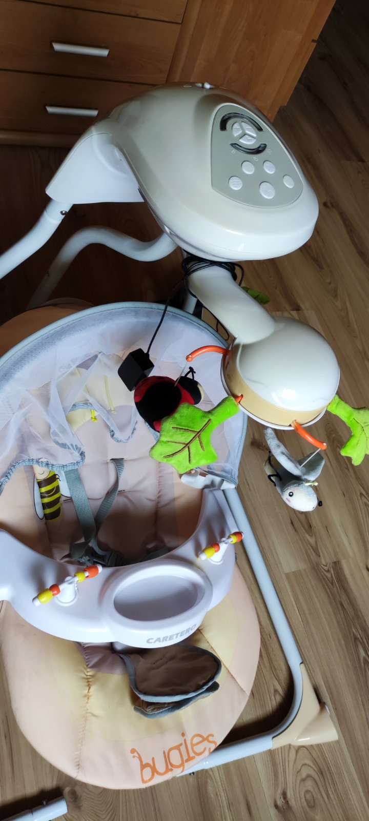 Parádne hojdacie lehátko s 3 stupňami intenzity hojdania, na výber niekoľko peknych kľudnych melódií. Poťah prateľny a lehatko sa dá zložiť. Na madle 2 visiace zvieratká. Skvele stimuluje úchop aj ...