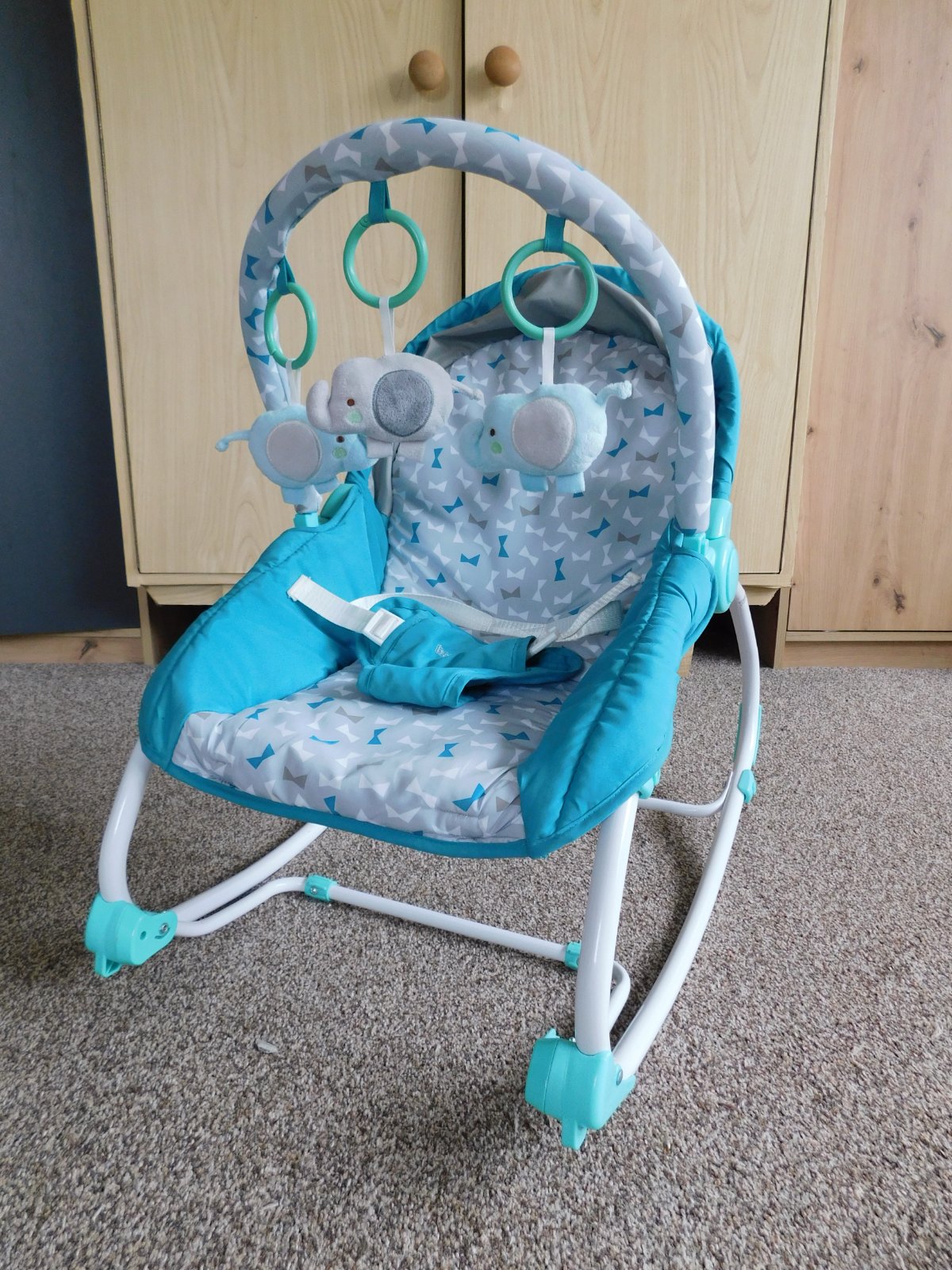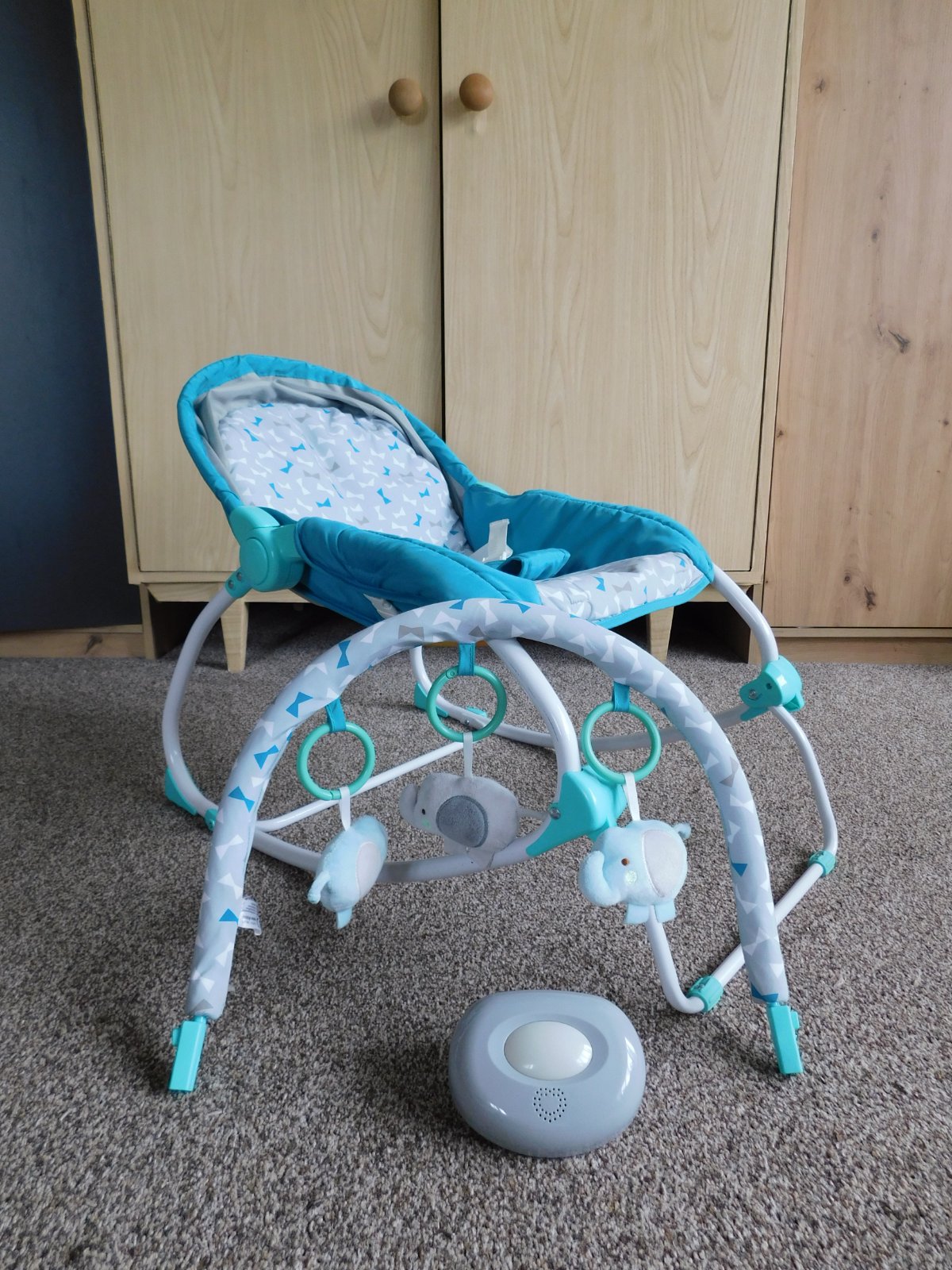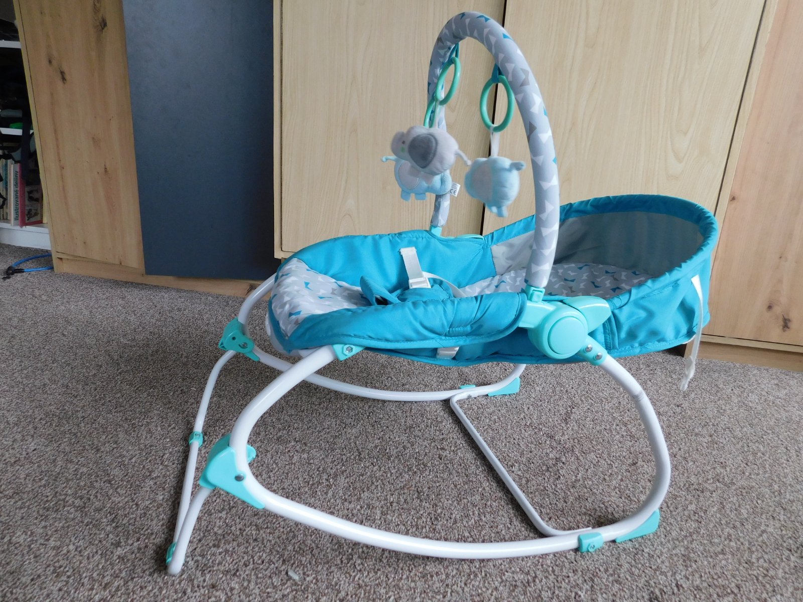 Multifunkčné hojdacie lehátko/kresielko až do váhy 18 kg. Vhodné aj pre malé bábätko nakoľko sa dá sklopiť takmer do úplného ľahu. Poťah sa dá dať dole a oprať, hrazdička so sloníkmi (dajú sa vymeniť za inú hračku) je tiež odnímateľná. Opierka chrbta je polohovateľná. Hrá, svieti, vybruje (potrebné sú tri 1,5V baterky). Výborný stav. Malé odretie kovovej konštrukcie (viď. foto). Pekná tyrkysová farba