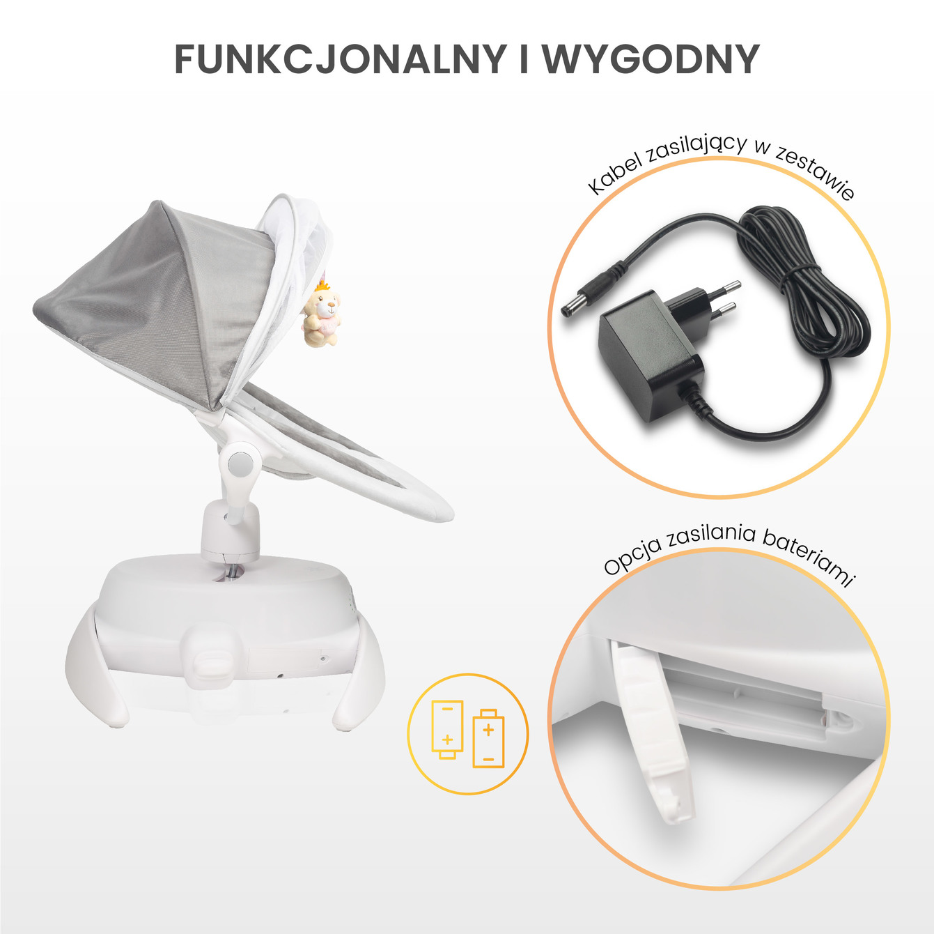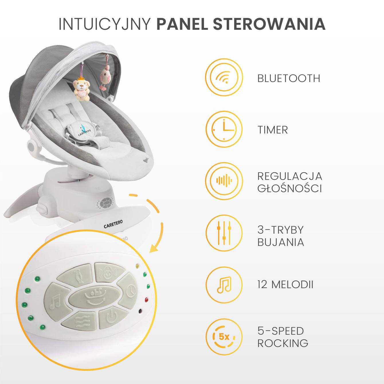 5-stupňová regulácia rýchlosti a vstavaný časovač vám umožní dokonale prispôsobiť zariadenie potrebám vášho dieťaťa. Rocker ponúka 11 melódií a tiež režimy so zvukmi vody a spevom vtákov, ktoré podporujú relaxáciu a uľahčujú zaspávanie.