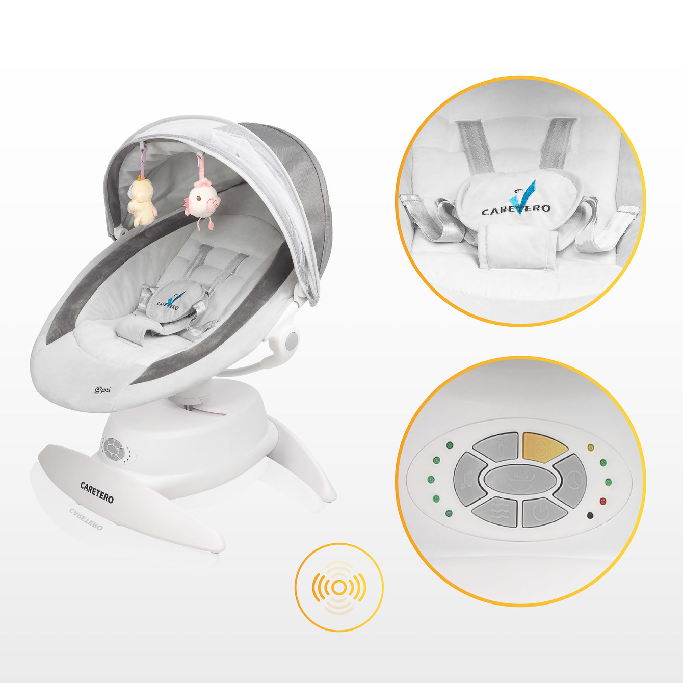 OPTI ponúka tri rôzne režimy hojdania: zadnú časť, celé lehátko a prednú časť, ktorá poskytuje komplexnú a personalizovanú zábavu pre vaše dieťa. Nastavenie rýchlosti hojdania umožňuje prispôsobiť pohyb potrebám dieťaťa – od jemného hojdania až po rýchle upokojenie.