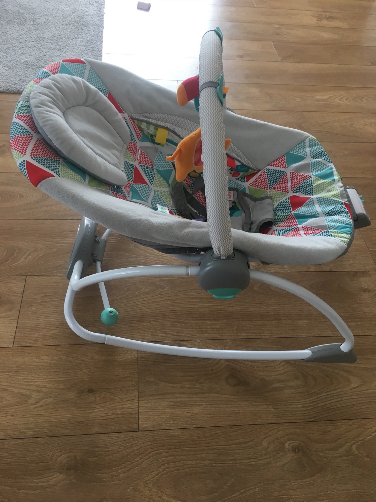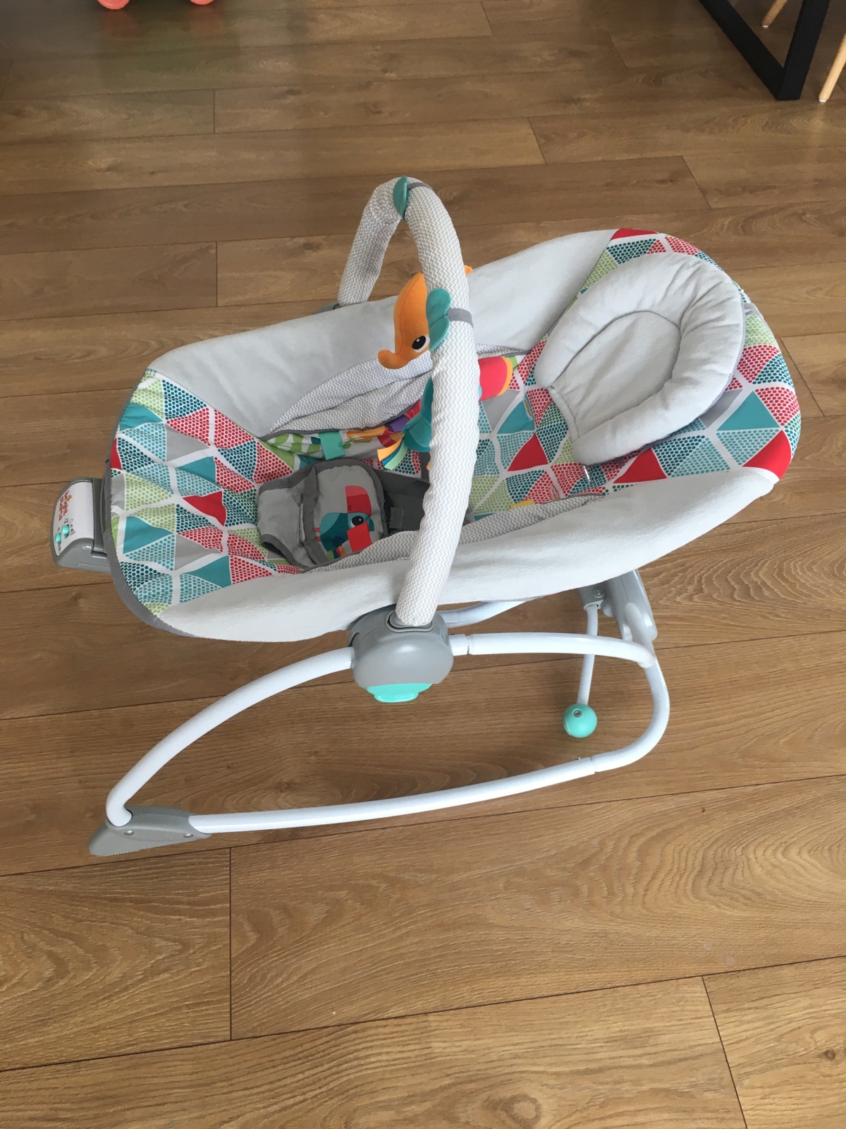 Parádne hojdacie lehátko s 3 stupňami intenzity hojdania, na výber niekoľko peknych kľudnych melódií. Poťah prateľny a lehatko sa dá zložiť. Na madle 2 visiace zvieratká. Skvele stimuluje úchop aj ...