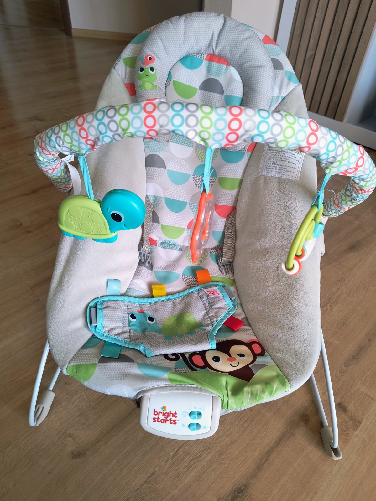 Kupovane nove, PC skoro 60€. Bez poskodeni plne funkcne. Krasne ziarive farby, vhodne rozmerovo aj pre vacsie deti, hrazda odnimatelna, potah tiez a da sa oprat. Kresielko jemne vibruje, je na bate...