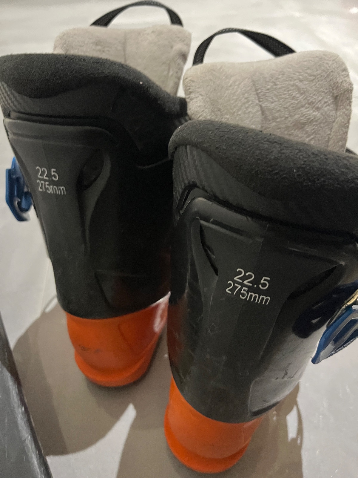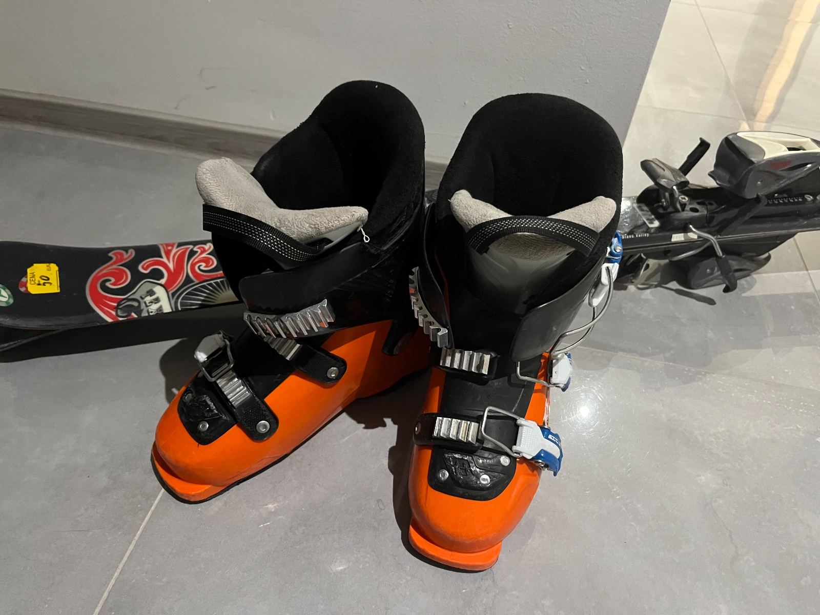 Pouzvane lyže s lyžiarkami vhodne na prvé lyžovanie a učenie. dĺžka lyži 115 cm. Veľ. lyžiarok 22,5 - 275 mm