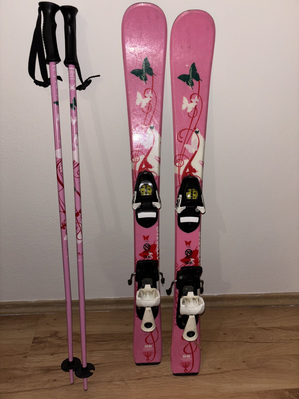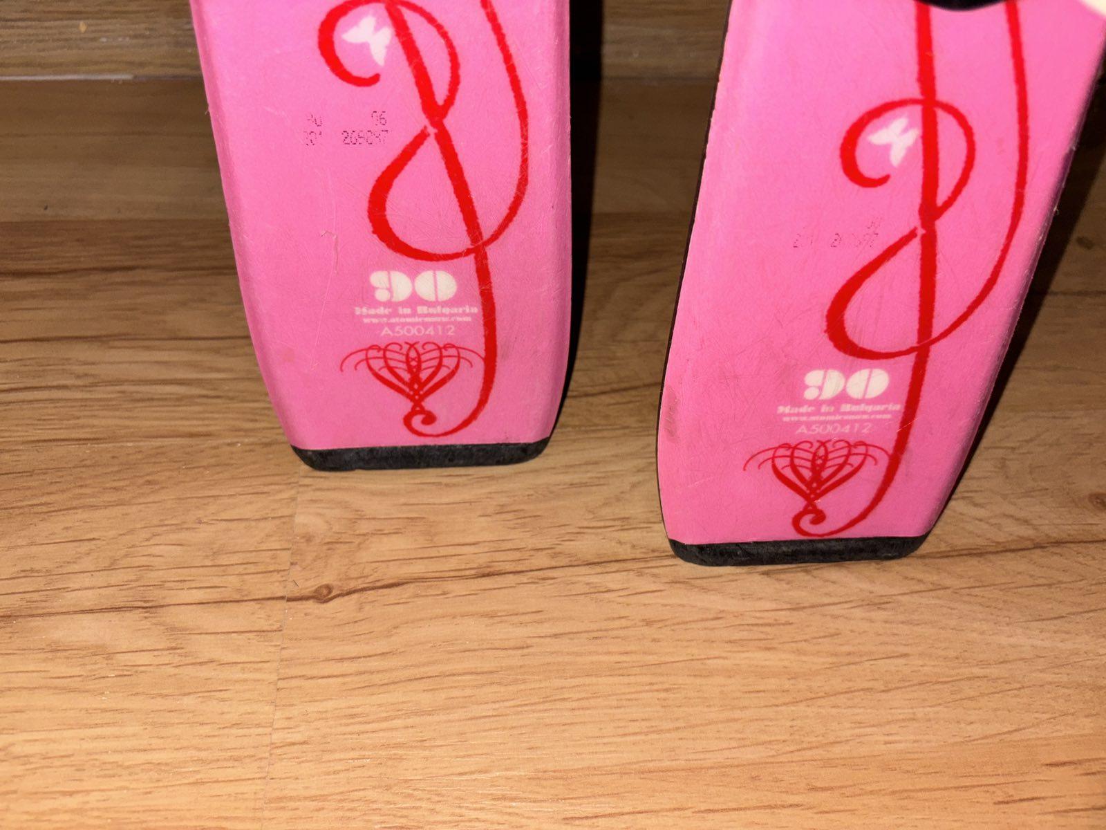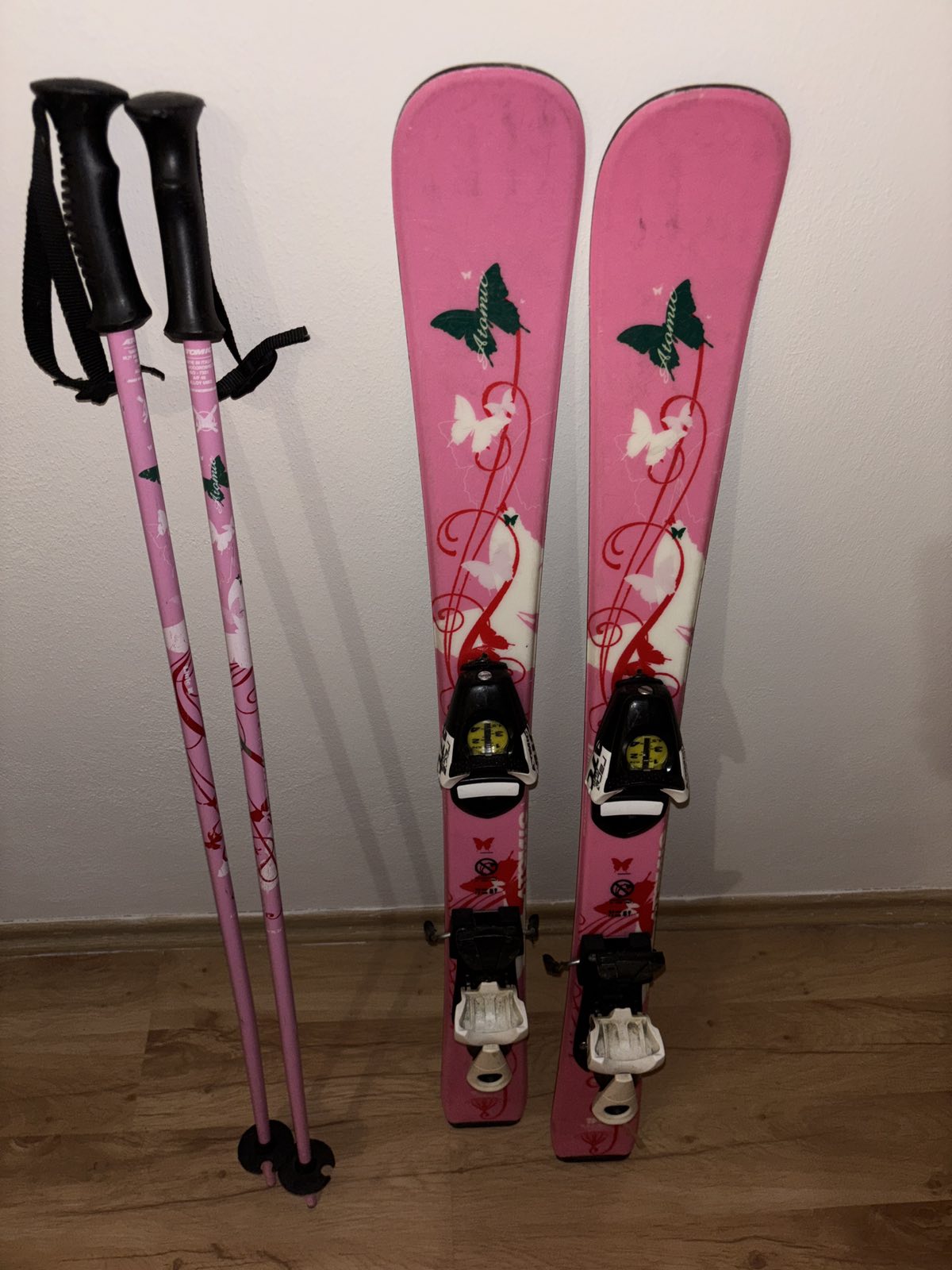 Užívane, veľmi dobrý stav, lyže dĺžka 90 cm s viazaním a paličkami, vsetko Atomic