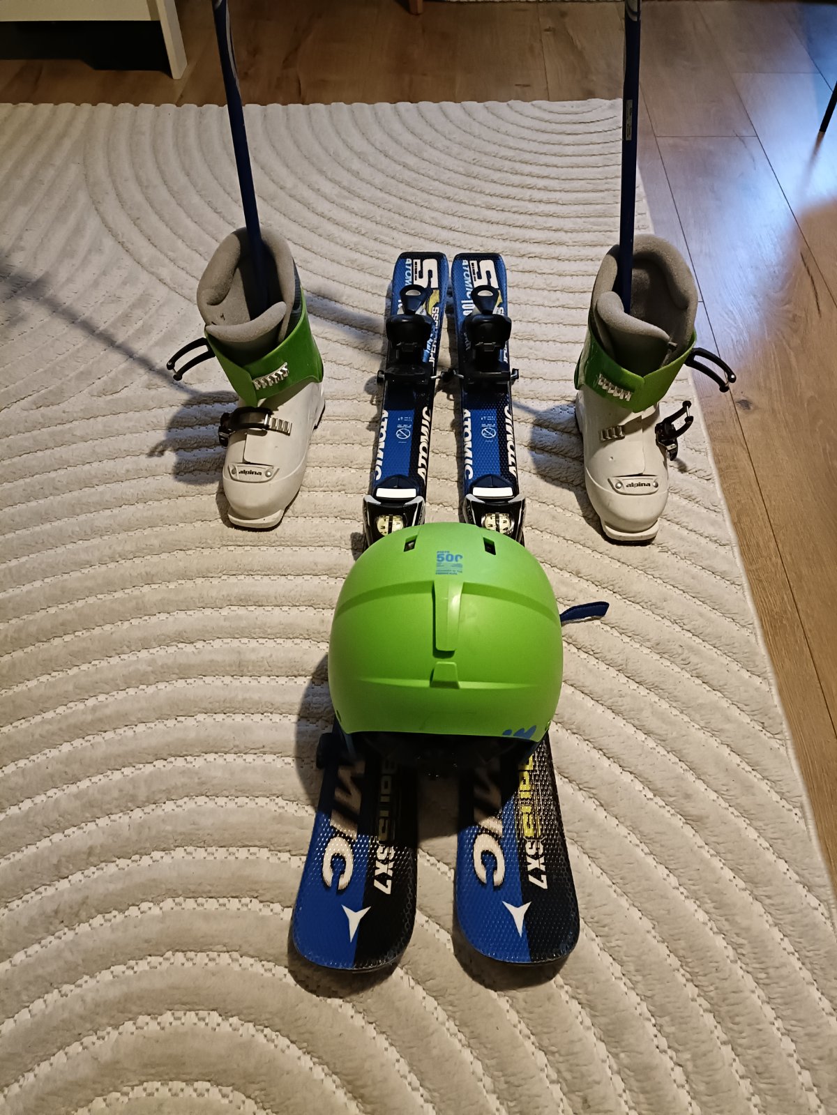 Na predaj, aj samostatne, lyže 100 cm+palice, lyžiarky 34, prilba XS, viem pribaliť aj rukavice, okuliare.