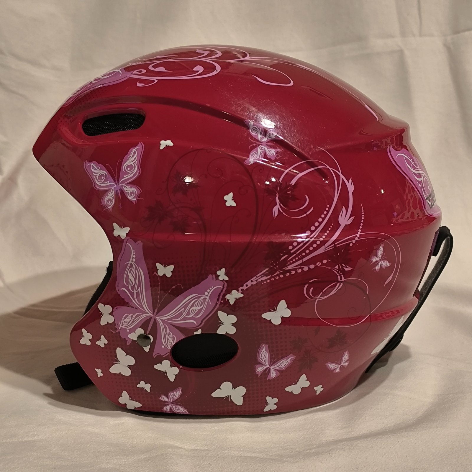 Lyžiarska - snowboardová prilba... Červená s kresbou (motýliky), má vetracie otvory, zapínanie pod bradou, pásik na prichytenie lyžiarských okuliarí...