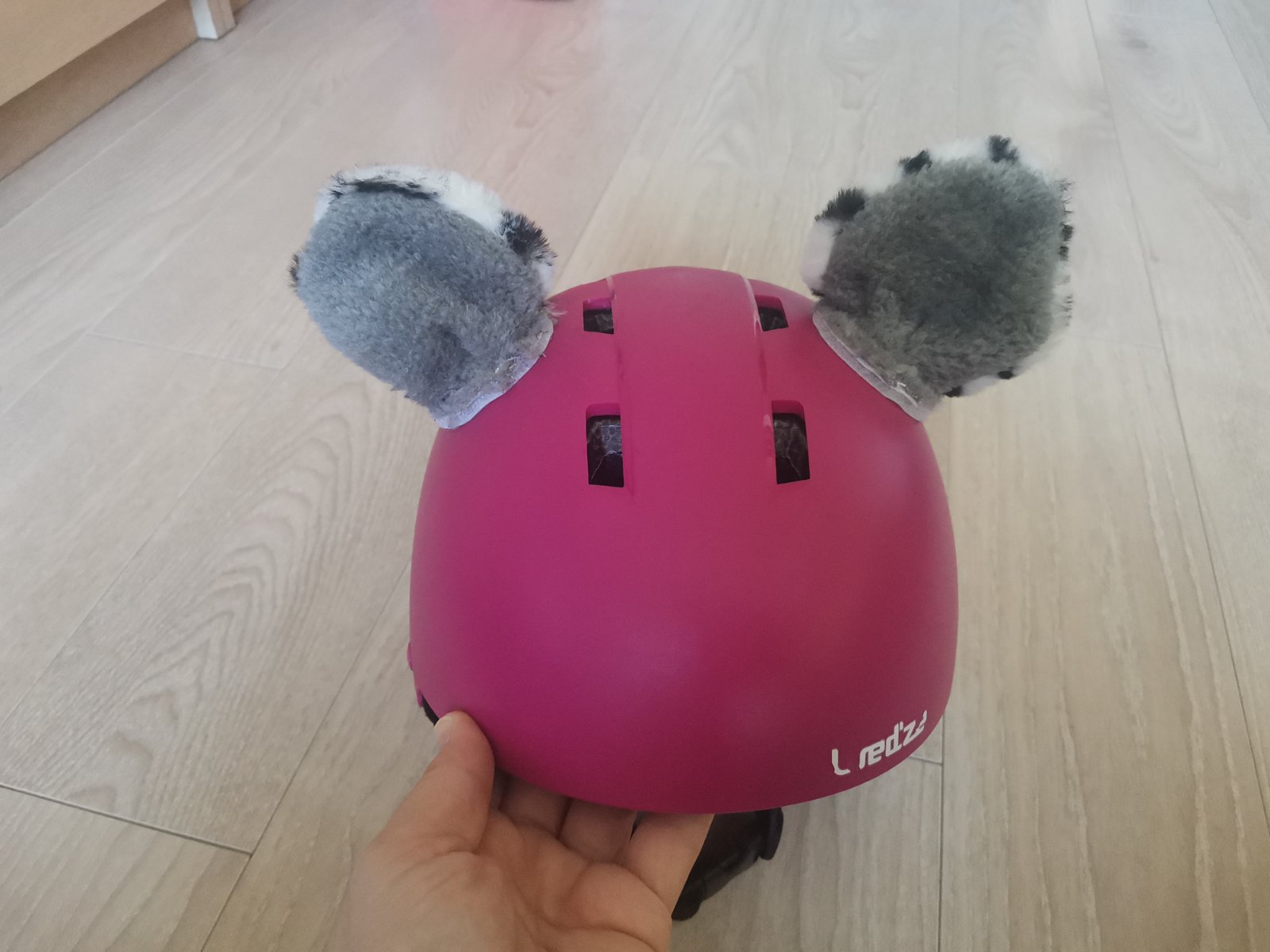 Prilba Wedze H100, nosená, doplnená o leopardie ušká, prilba má jemné škrabanceky, ale pri bežnom nosení ich nevidno. K nej flísová kukla Hi-tec.