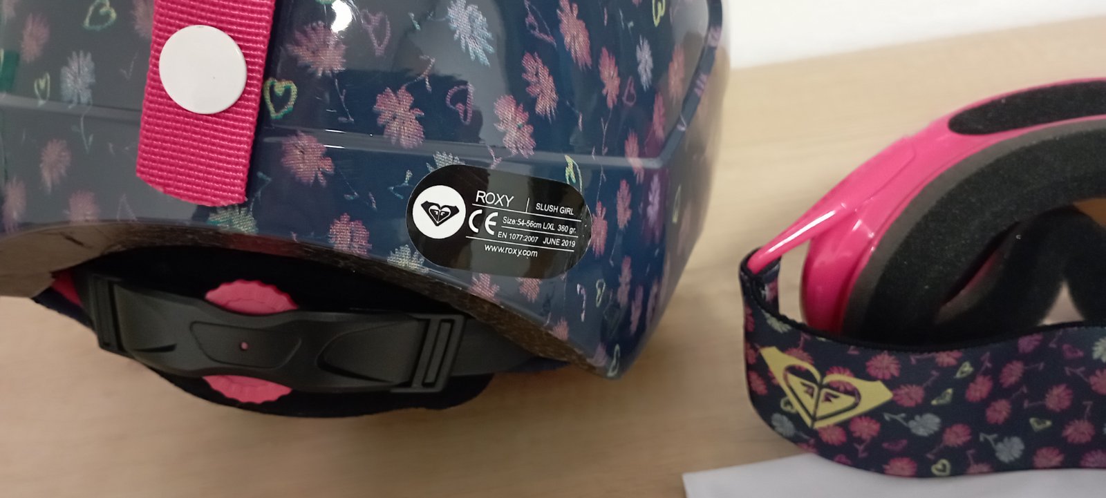 dievčenská lyžiarska prilba + okuliare značky Roxy, nosené, bez poškodení, veľkosť výrobcu uvedená L/XL pre obvod hlavy 54 - 56 cm, orientačne vekovo sedí od 7-12 rokov vrátane lyžiarskych okuliarov