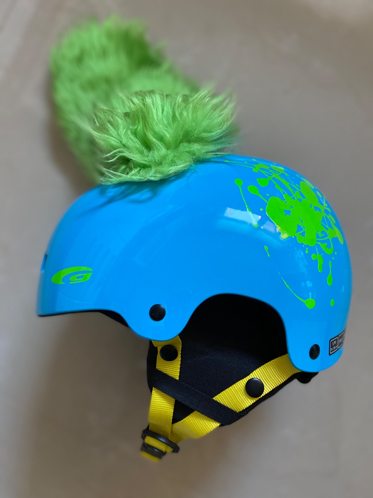 Krásna a pohodlná lyžiarska prilba v žiarivej modrej farbe so zelenými fľakmi a “crazy ears” ušami. Uši sú na suchý zips a dajú sa čiastočne alebo úplne odstrániť. Prilba je ako nová, super stav. Zvnútra je makkučká, akoby semiš. Je to veľkosť S/M, na obvod 55-58cm a má nízku váhu 490g, čím je super vhodná pre deti. Pôvodná cena prilby 54,99€, kúpená v akcii za 44,99€ a uší 13,90€.