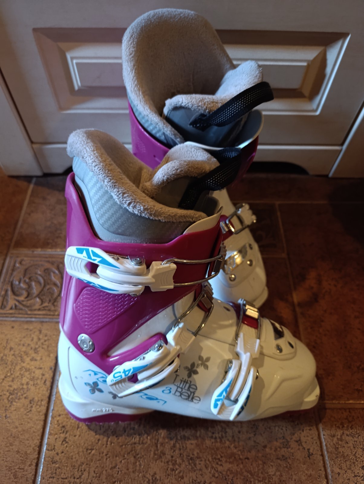 Predám dievčenské biele lyžiarky, značky LANGE. Veľkosť je taká 36-37, vnútorná dĺžka je 24,5 cm, skelet má veľkosť 284mm. Vnútorná papuča je bez poškodení, sú poriadne teplé. Sú nosené, na fotke j...