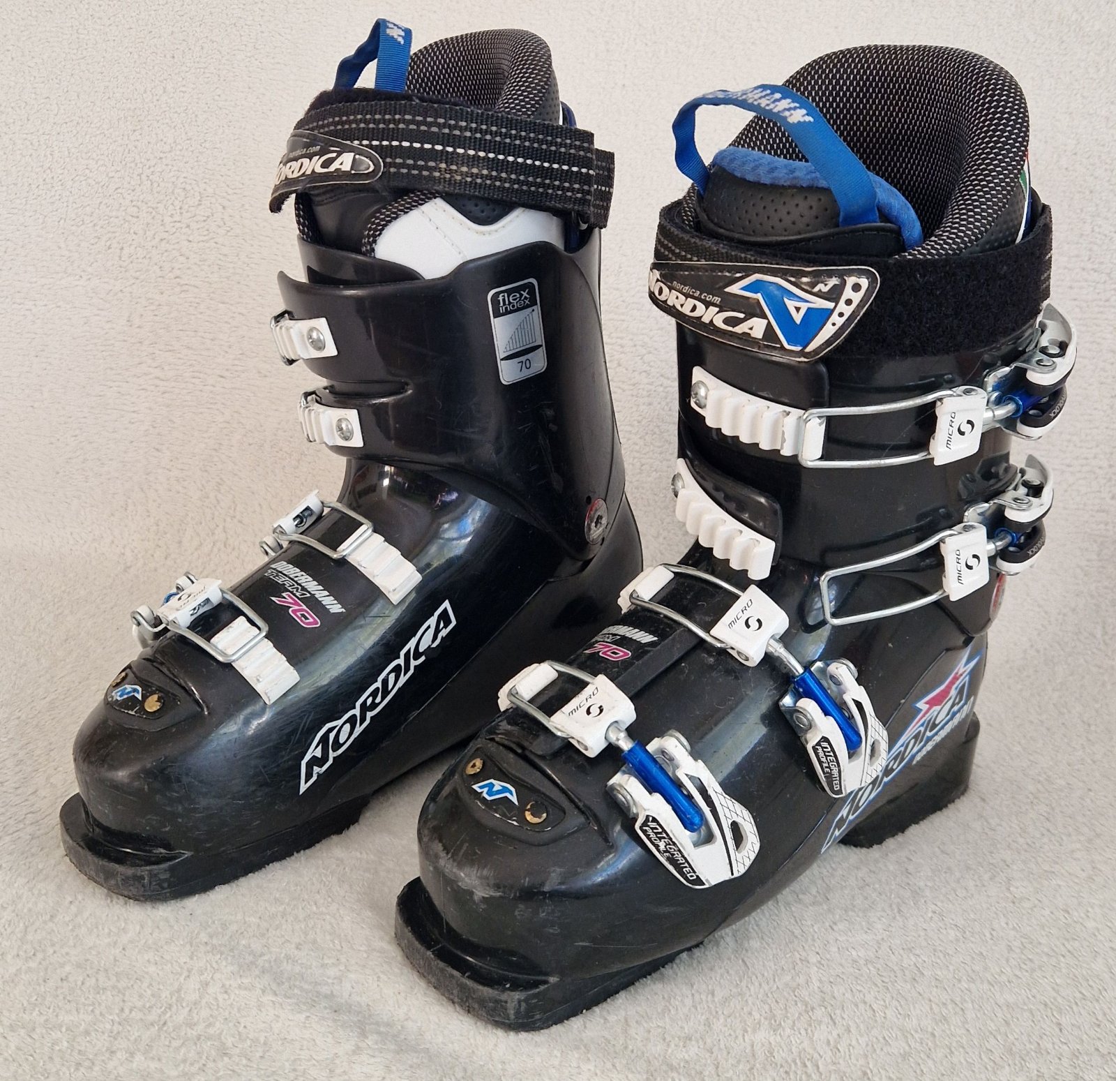 Lyžiarky Nordica 23-23,5 s flexom 70. Majú 4 klipsy + pásku pre dôkladné uchytenie nohy. Všetky klipsy majú mikronastavovanie dĺžky. Sú používané ale zachovalé a určite ešte poslúžia.