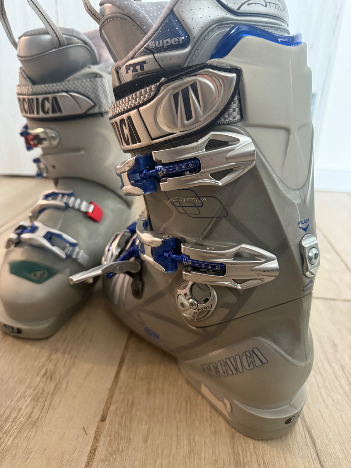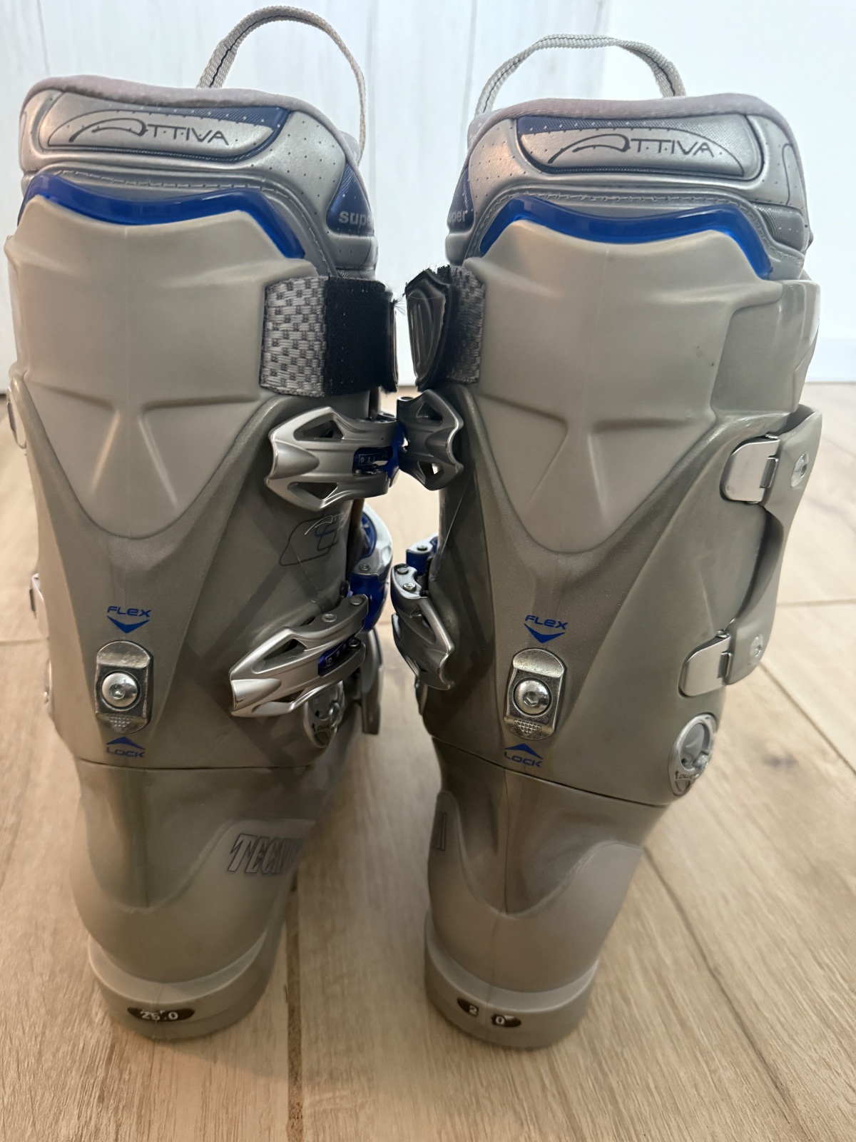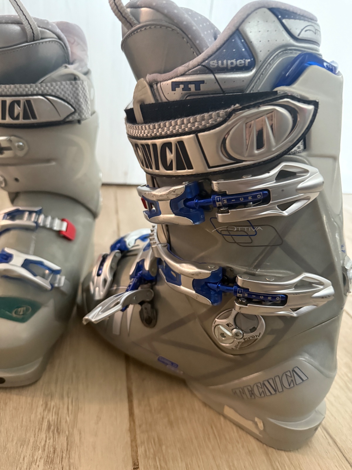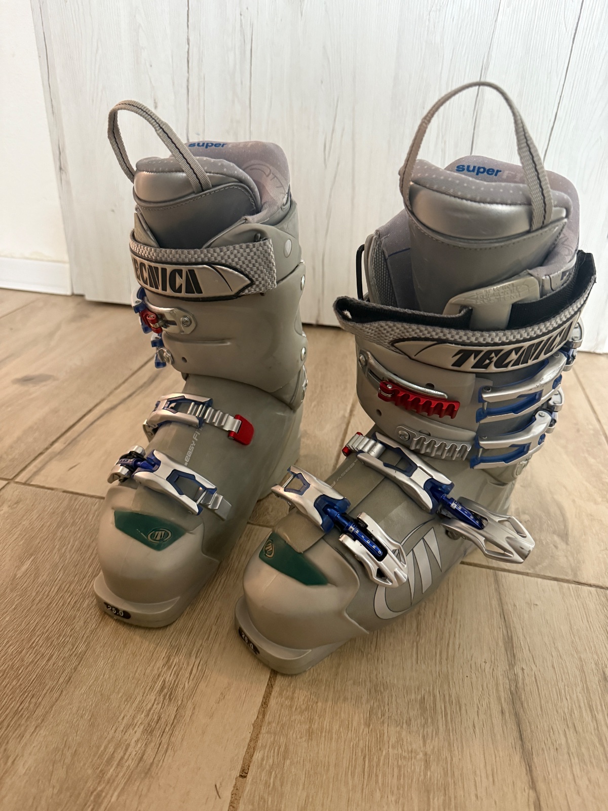 lyžiarky tecnica veľkosť 39, vnútorná dĺžka ma 25 cm, skelet 296 mm, pevne klipsy, nastaviteľné na lýtku, microsystem