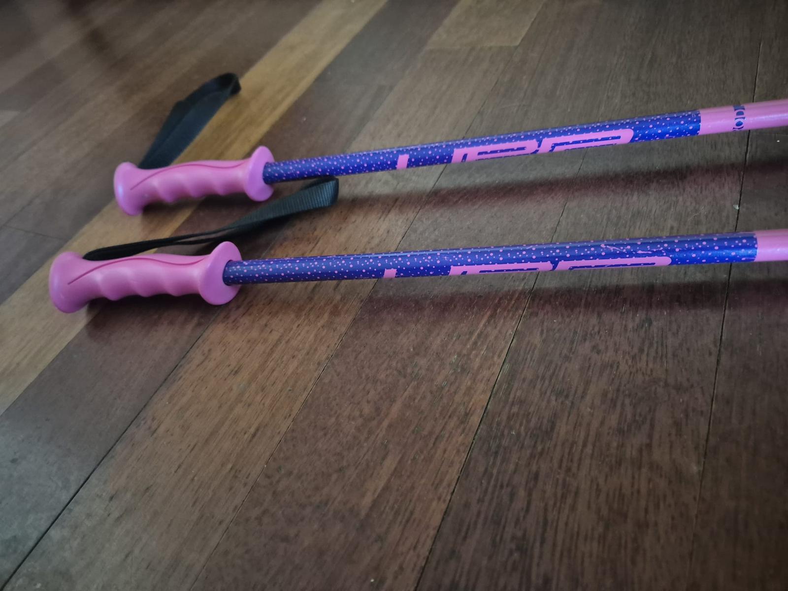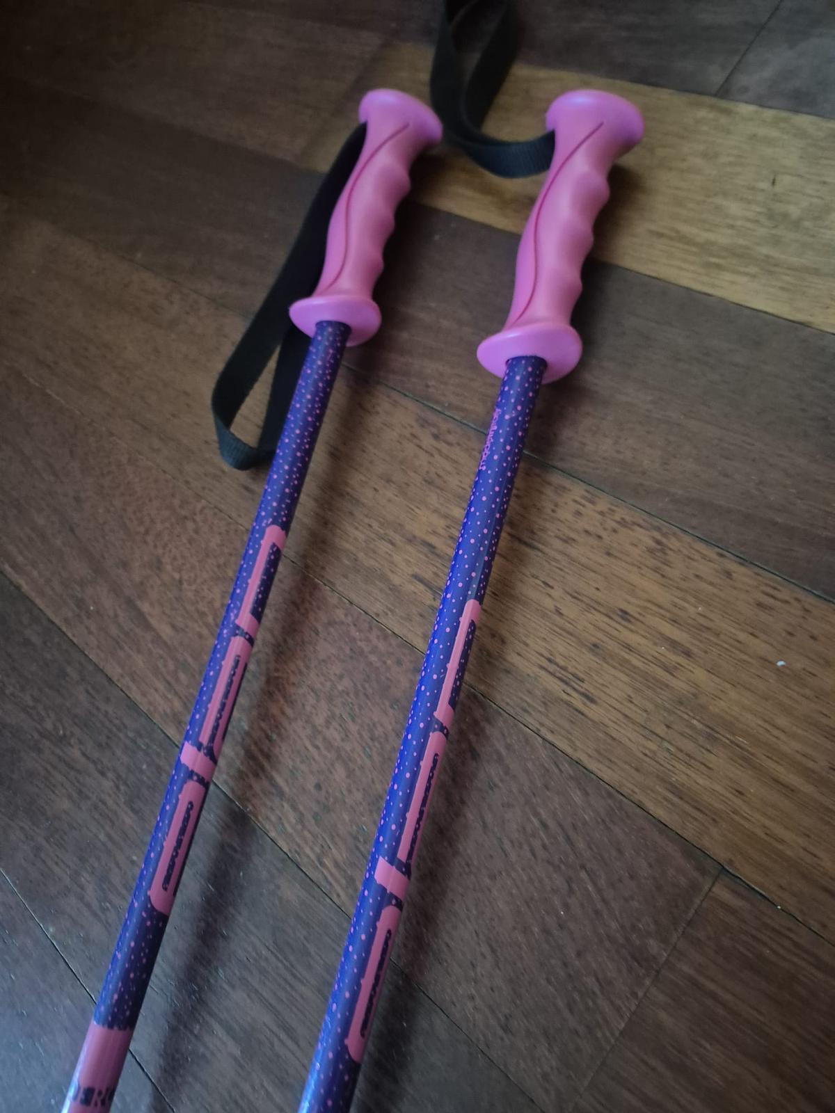 palice LEKI červené 95 cm, palice Atomic ružové s jednorožcami 85 cm. Lyže - predané, palice po 10€
