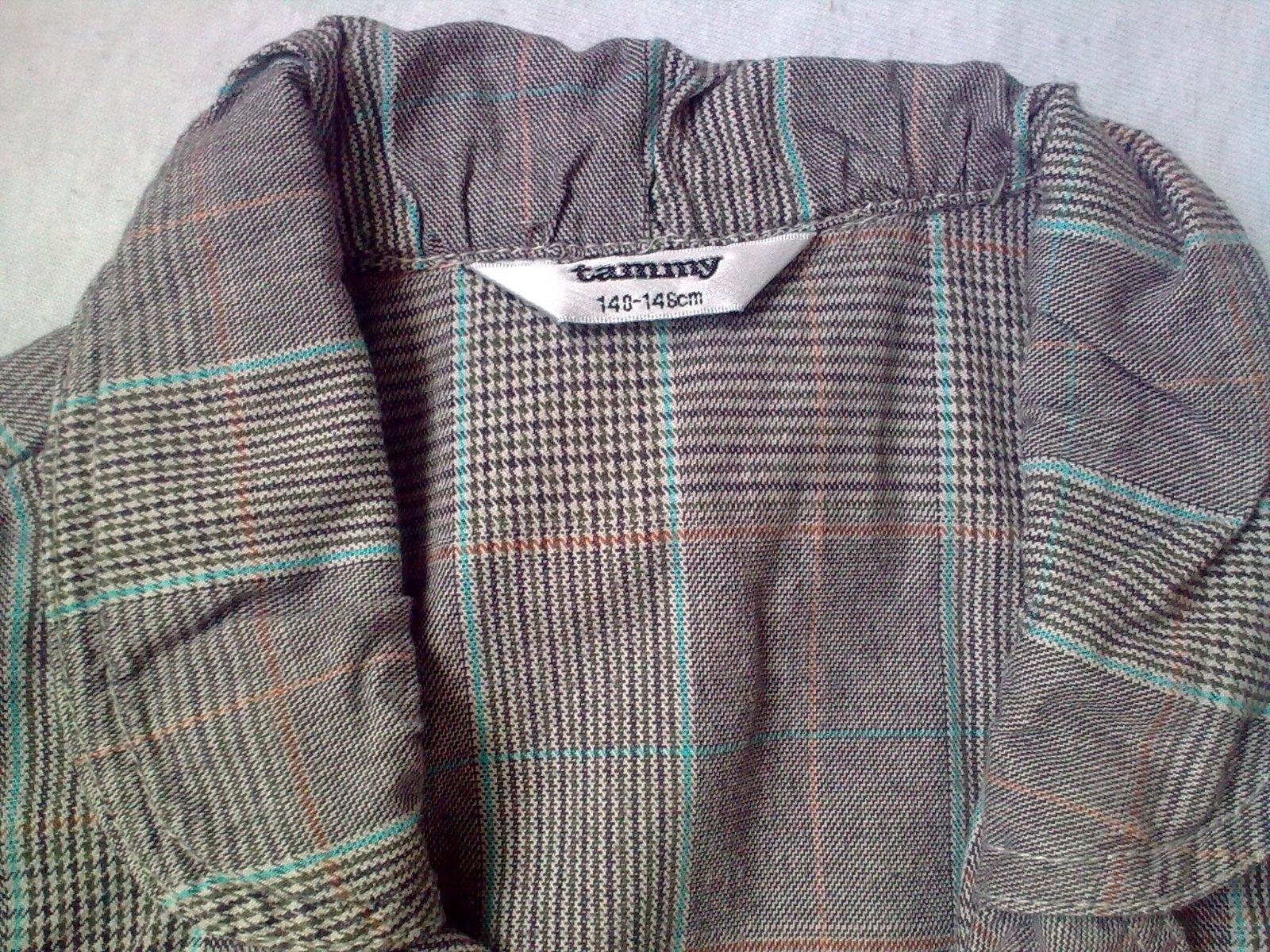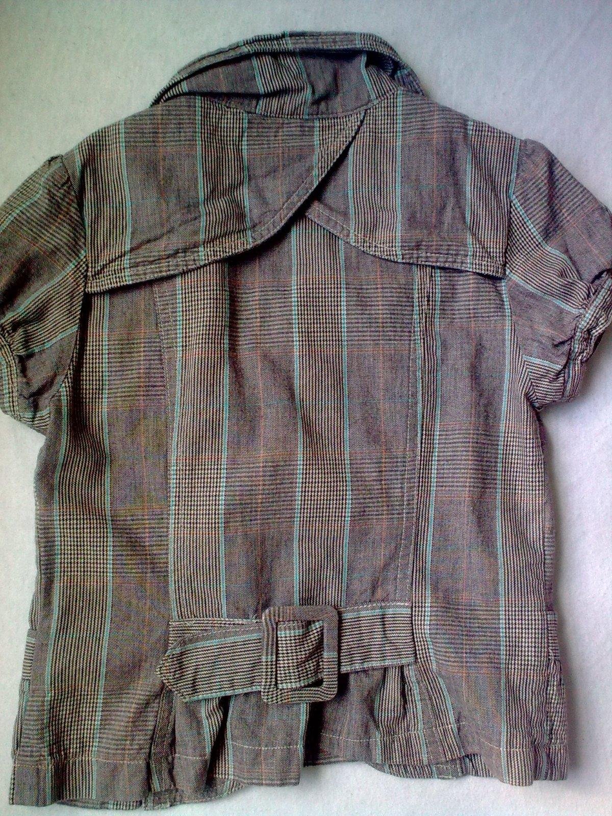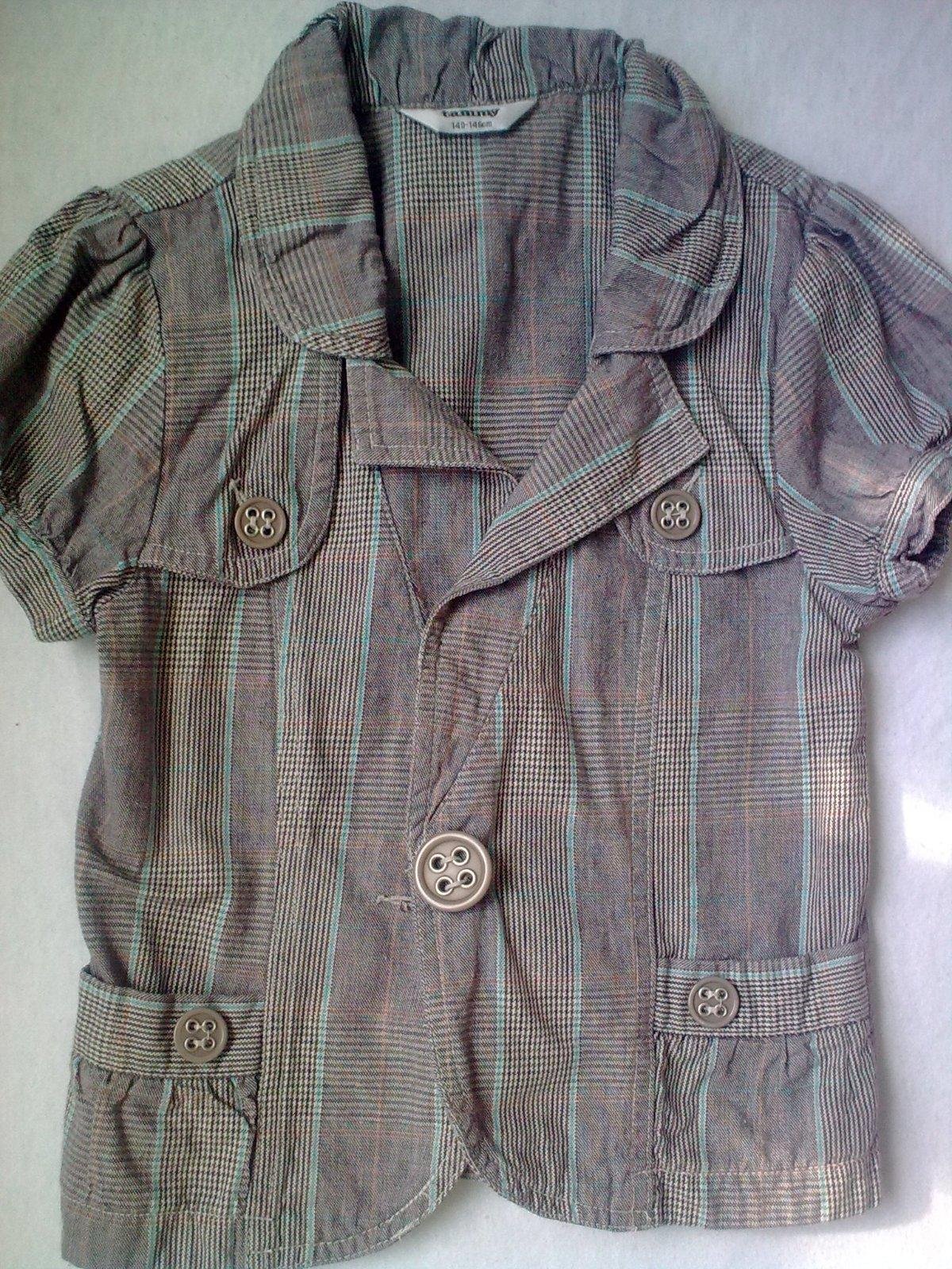 Šedonedé kárované sako/bolerko s krátkym rukávom, zapínanie na 1 gombík, vpredu 2 vačky. vzadu možnost stiahnutia prackou. Materiál bavlna, značka TAMMY. velkost písaná 140/146.