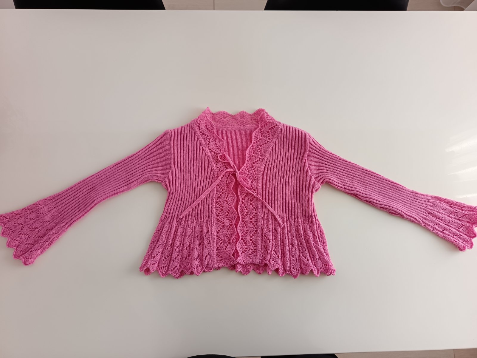 Svetrík ružovej farby, v skutočnosti o niečo svetlejší, ako na foto, zapínanie na mašličku, bez poškodenia