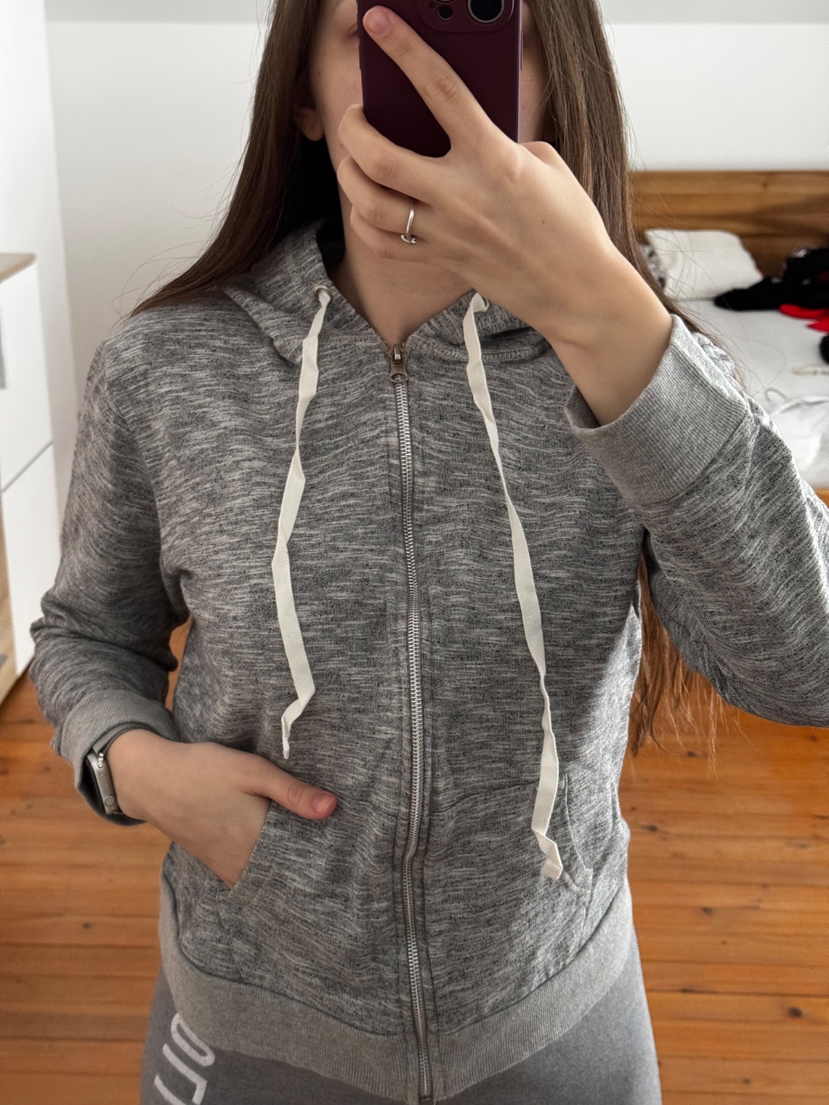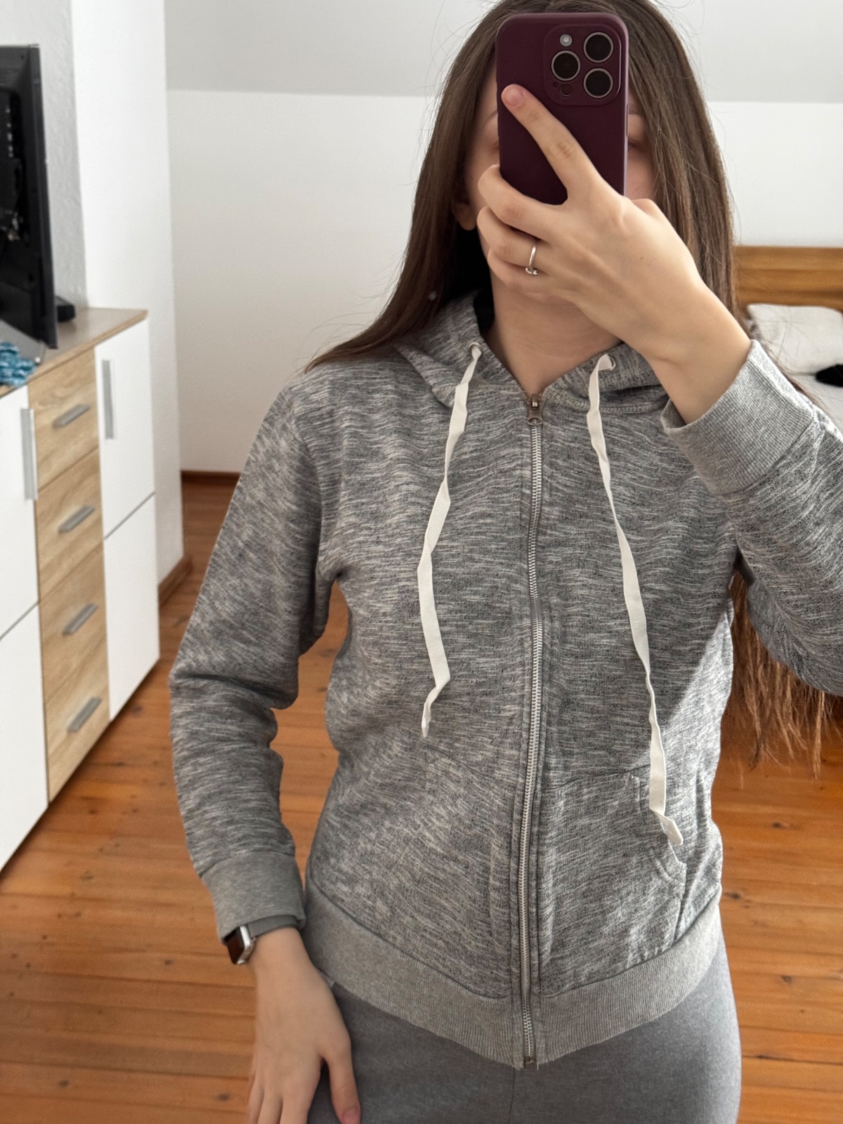 Krasna makkucka a teplucka mikina s uskami.Nenosena, neprana.Pisana je velkost L, ale sedi na M. Kupovala som rovnaku aj sestre vo velkosti M a su rovnake.Sestra na nu neda dopustit, naozaj odporuc...