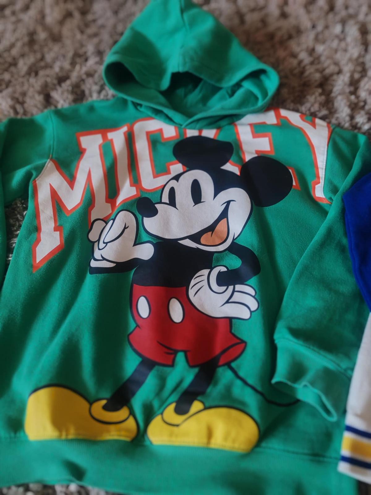dve krásne skoro nenosené mikiny H&M vo v. 8-9, pc za obe cca 50 eur, kupované nové, farebná na zips 2x vzatá, top stav, zelená mickey mouse vo výbornom stave