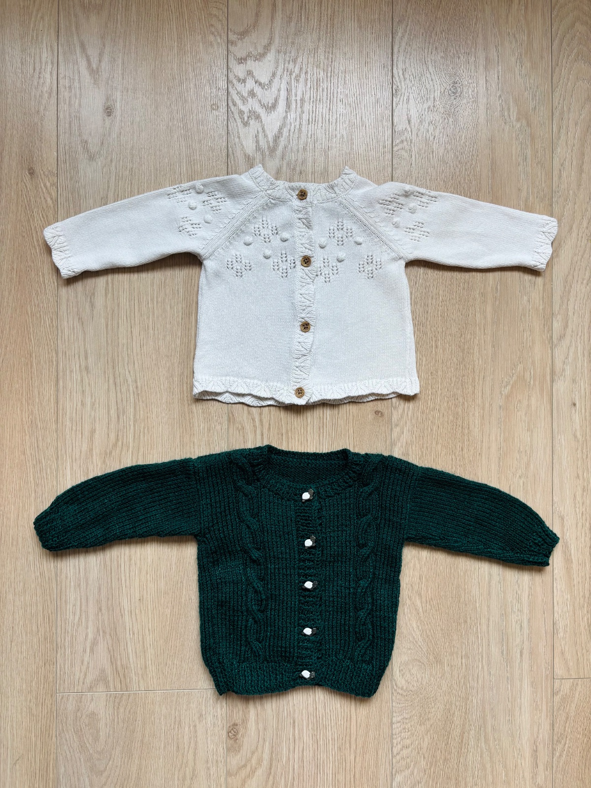 Krásne svetríky, striedali sme s inými, sú vo výbornom stave. Biely Fred&Flo, zelený štrikovaný. Cena za obidva, rozmery na fotkách.