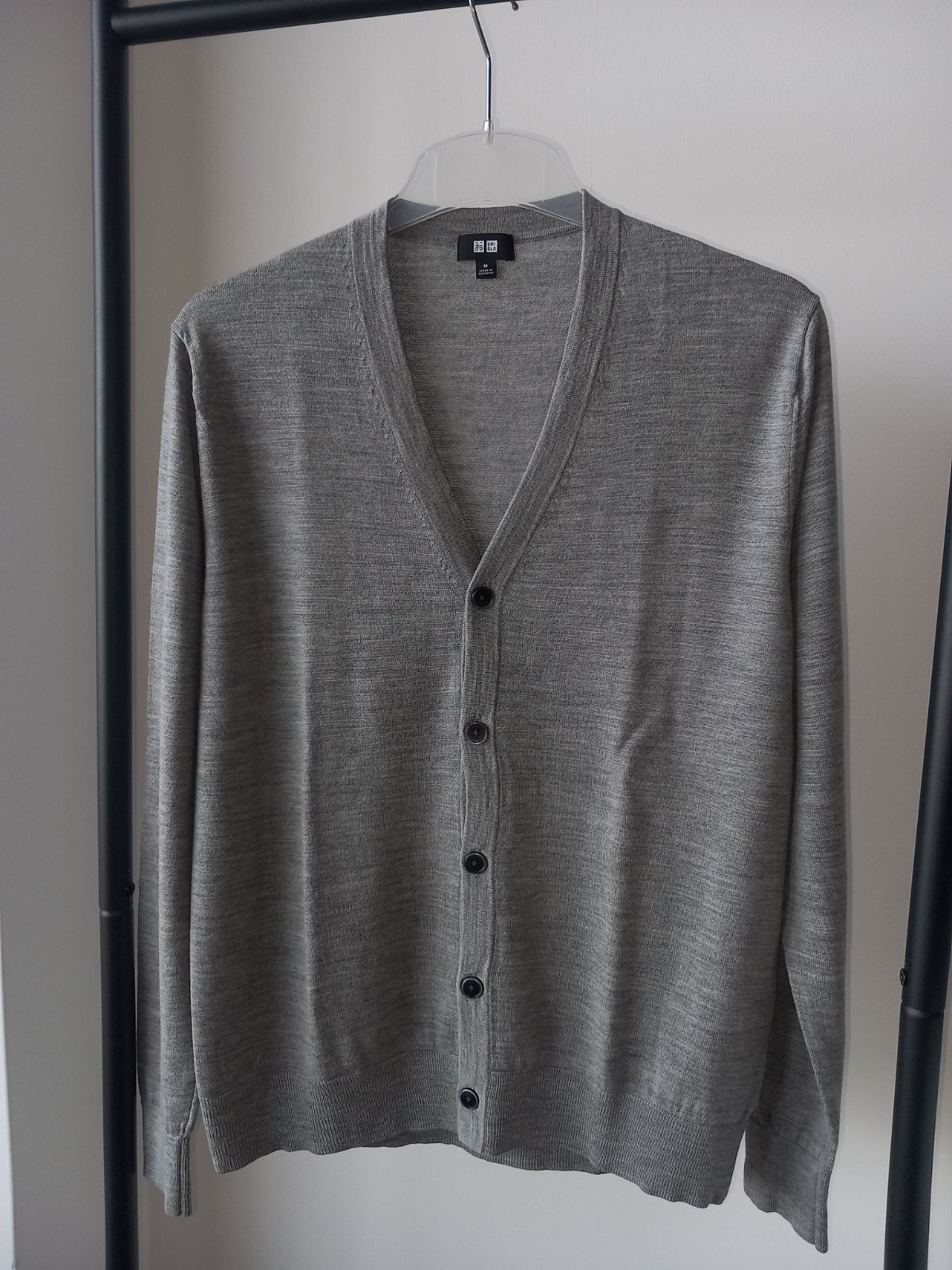 Svetlo šedý unisex kardigán od značky Uniqlo, ktorý zladíte v množstve outfitov. Je vynikajúci na vrstvenie v outfite.