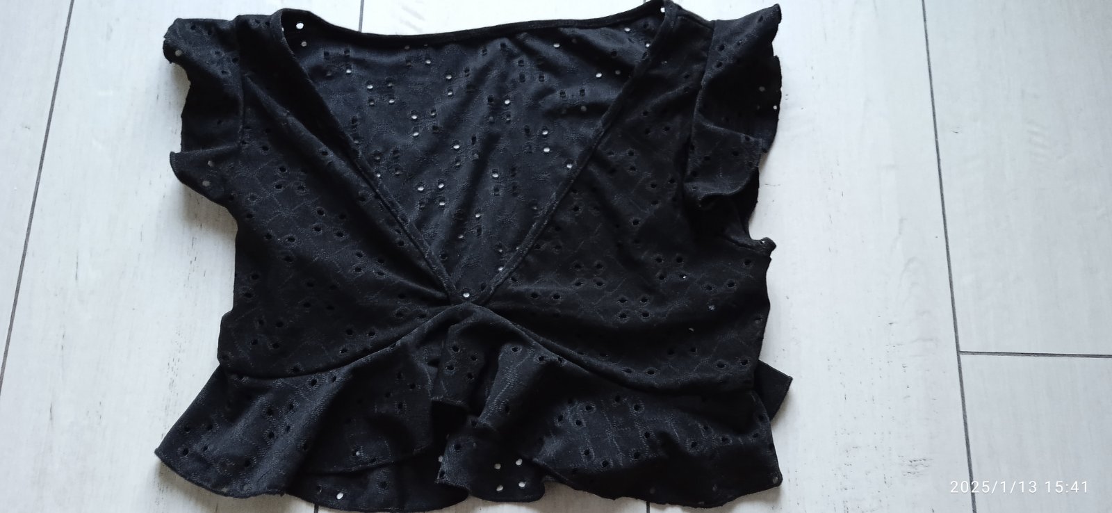 Čierne bolerko, kúpené tu na MK, keďže prišlo s dierkami, opravila som ho a našla kvietok. Padavá látka. Je mi malé, tak niekomu určite urobí radosť. Veľkosť S. Cena 2 €+ poštovné