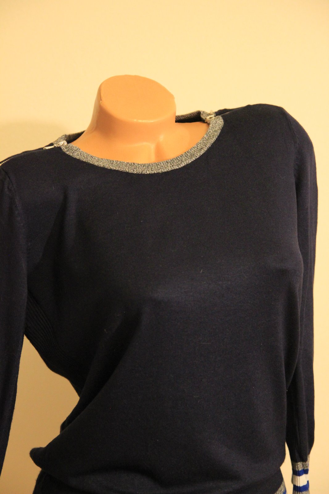 Tmavo modrý sveter, veľkosť M, na ramenách ma na ozdobu zipsy. Top stav. Materiál je 80%viskóza a 20%nylon.