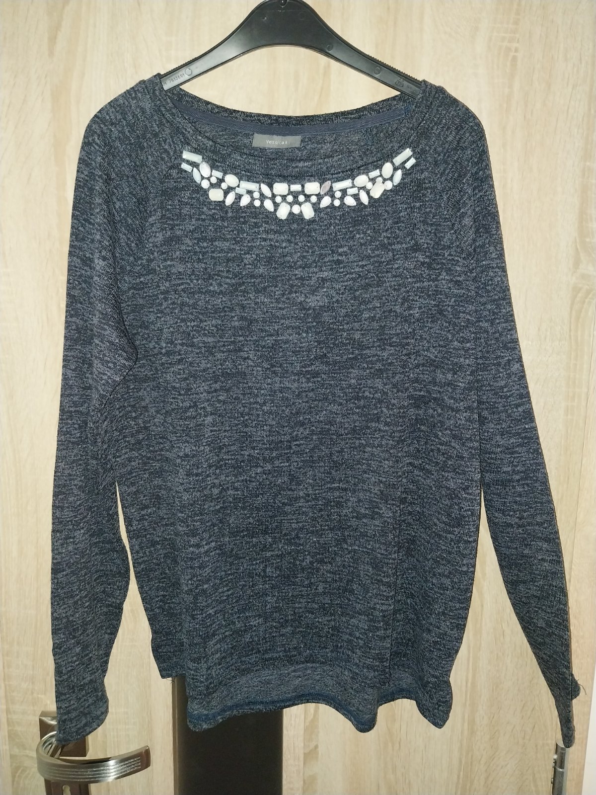 Dámsky značkový pulóvrík so striebornou nitkou. Má štruktúru. Dĺžka je 60cm, obvod hrudníka je 94cm a obvod pása je 90cm. Dĺžka rukáva je od krku 65cm. kód 1216