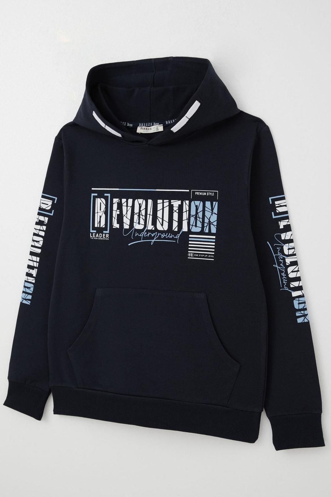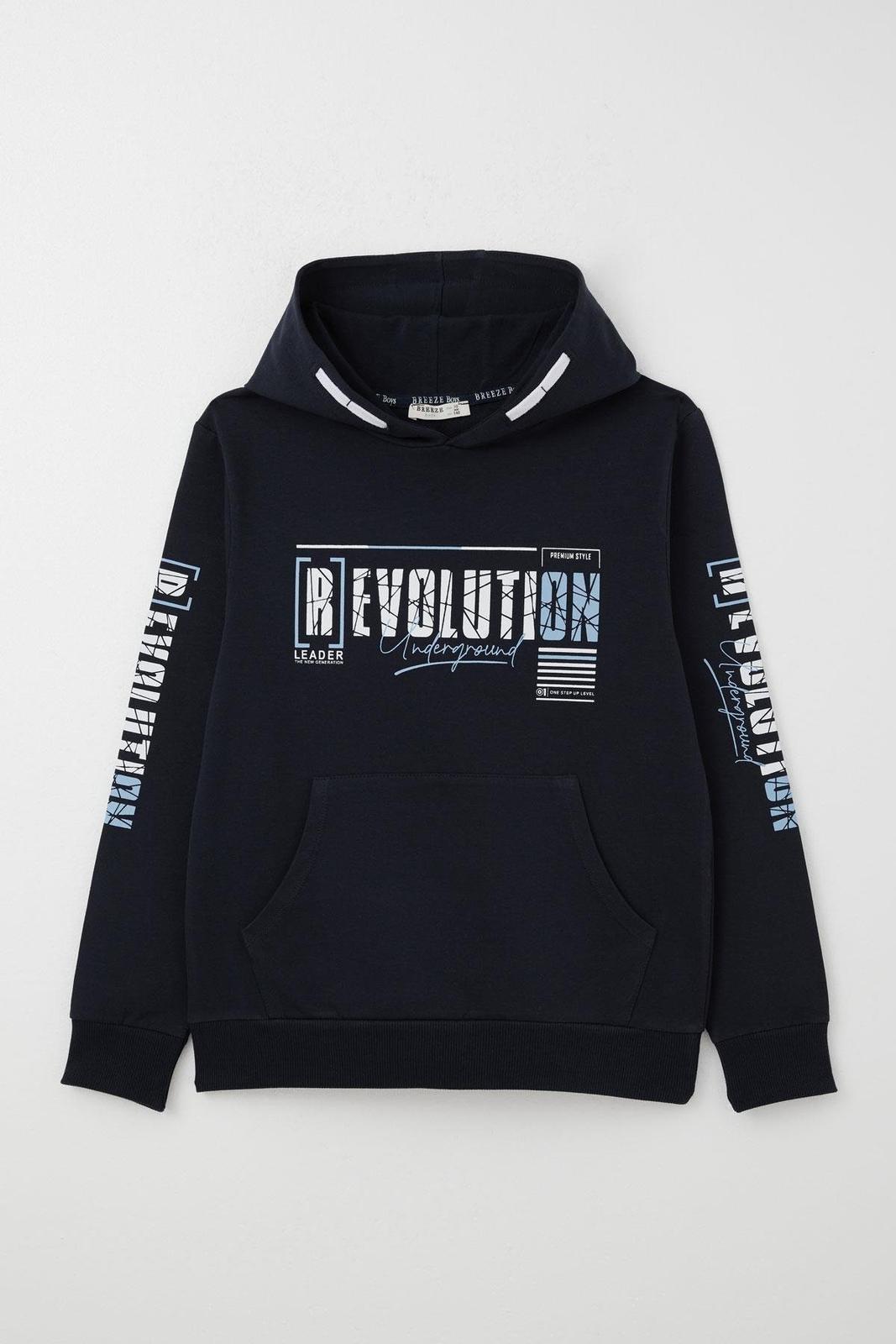 Chlapčenská mikina s modnou potlačou ,s kapucňou.Mikina ukončená do patentu ,v predu klokanie vrecko.