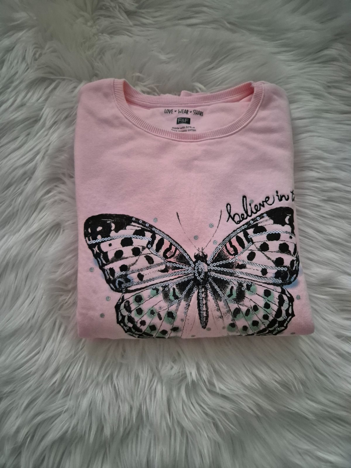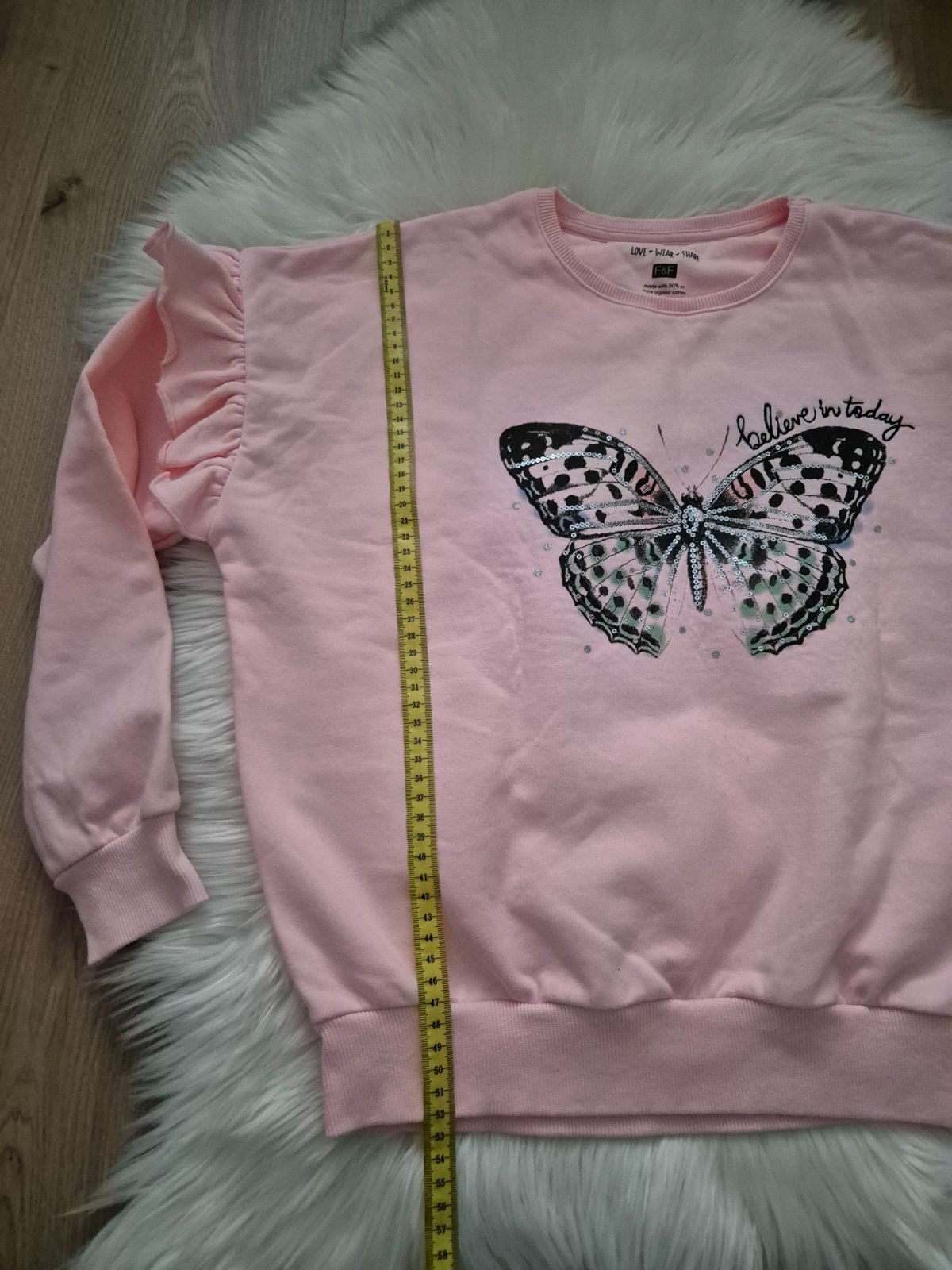 Predám dievčenskú teplákovú mikinu, zn. F&F, veľkosť 152, bledo ružovej farby, nosená, má malé žmolky, treba odžmolkovať a bude zase pekná, bez iného poškodenia.