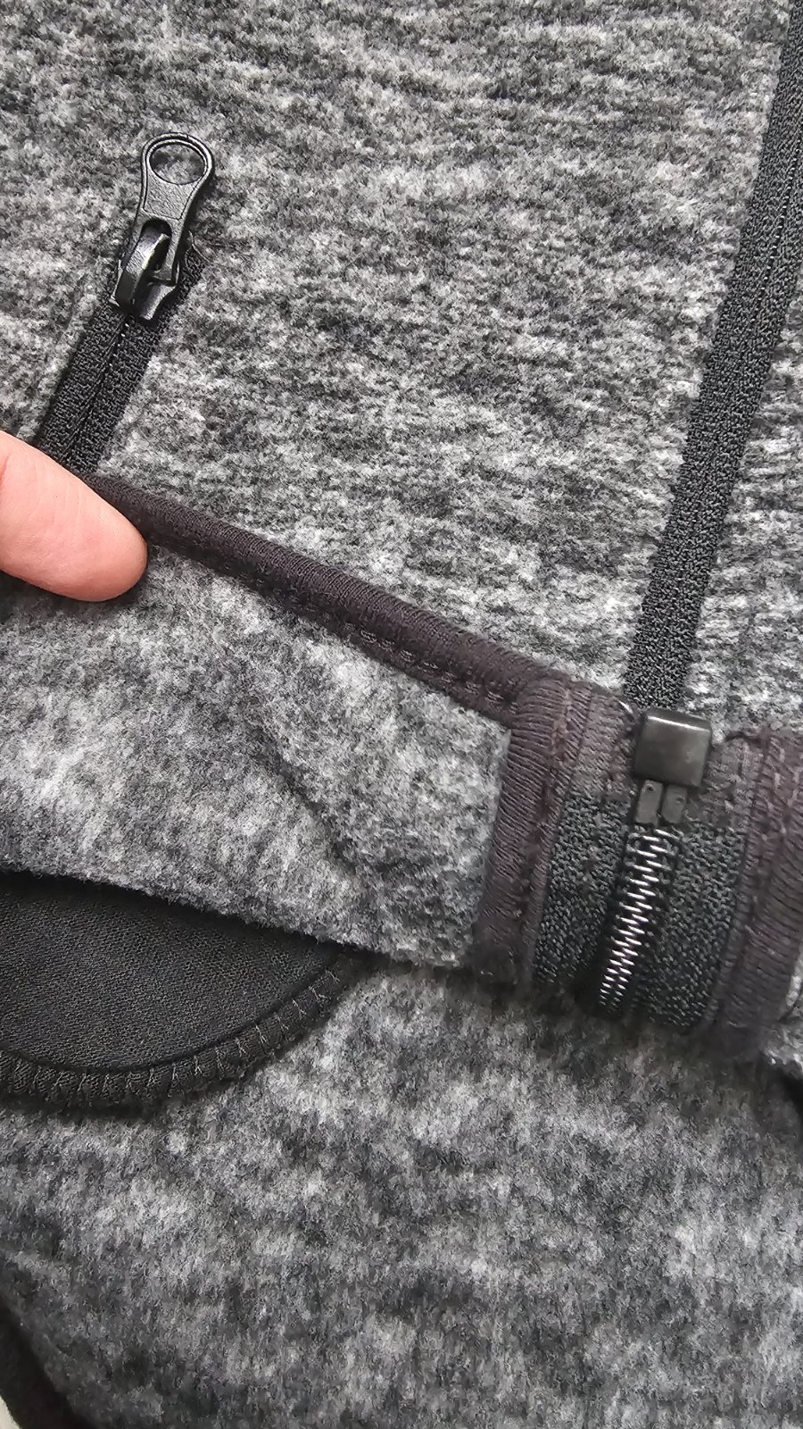Raz oblečená, tenká, tmavosivá mikina, mierne elastická, strih trochu do "A". Veľkosť je 48/50. Rukávy sú zakončené patentom tej istej látky. Mikina je "otvorená, je nutné si pod ňu obliecť tričko ...