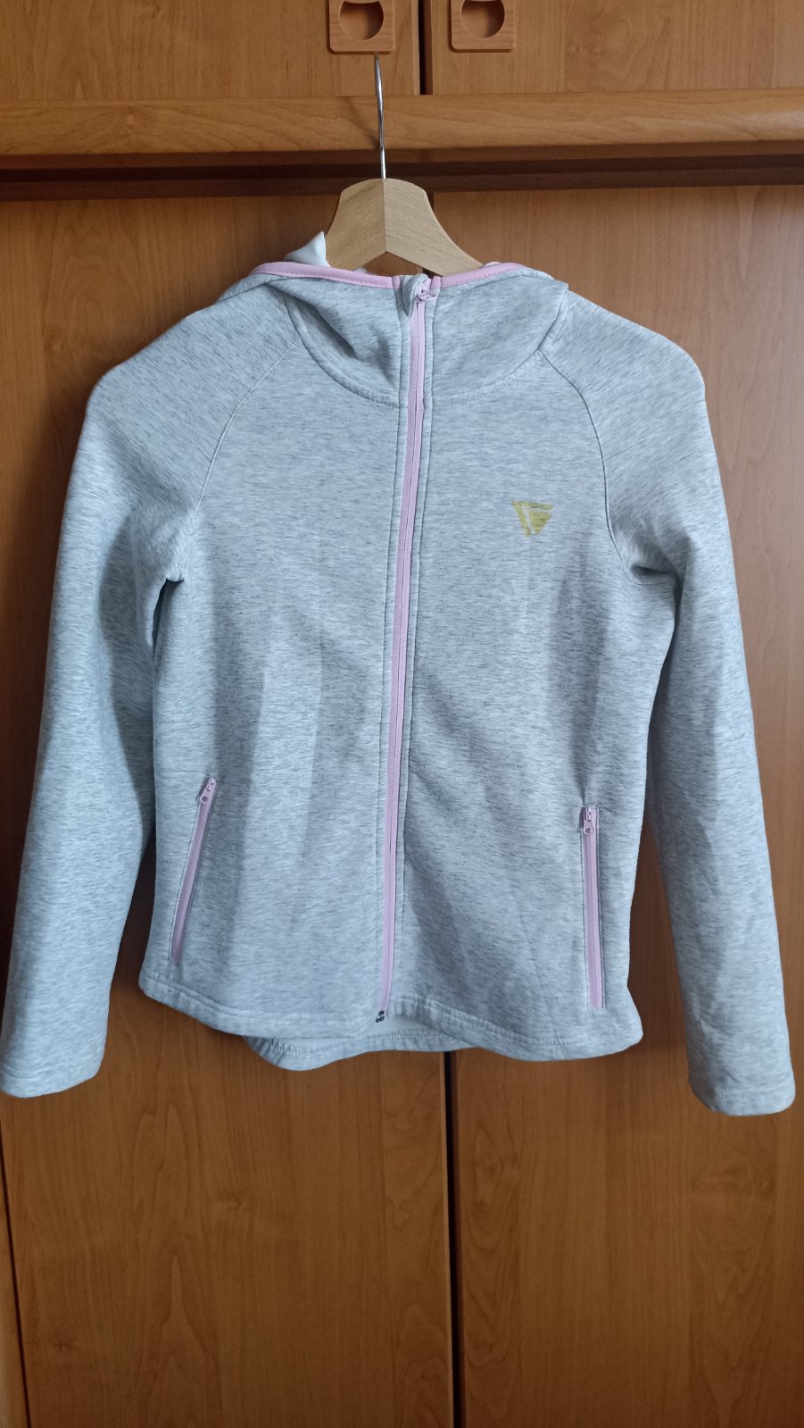 Dievčenská mikina s kapucňou a vreckami, svetlosivý melanž, zadný diel predĺžený, nosená, veľ. 146/152.