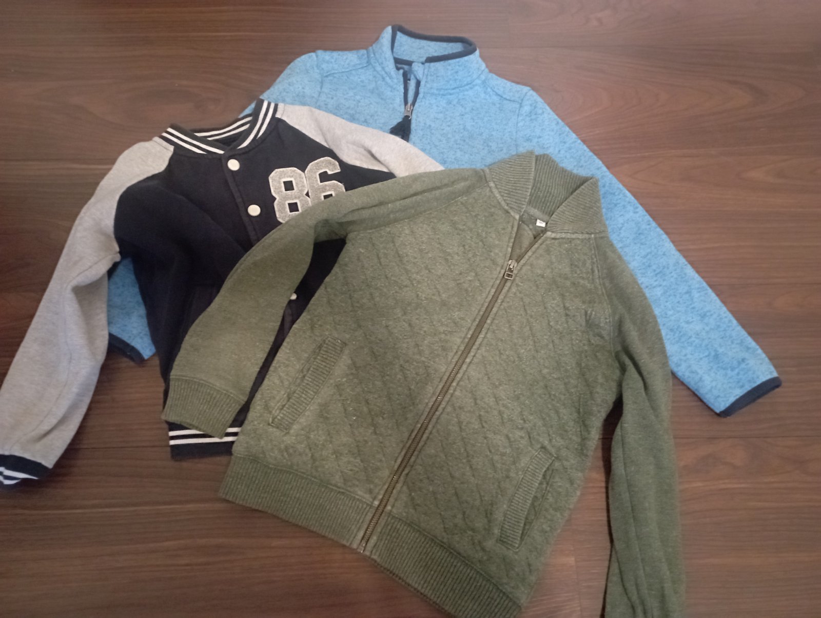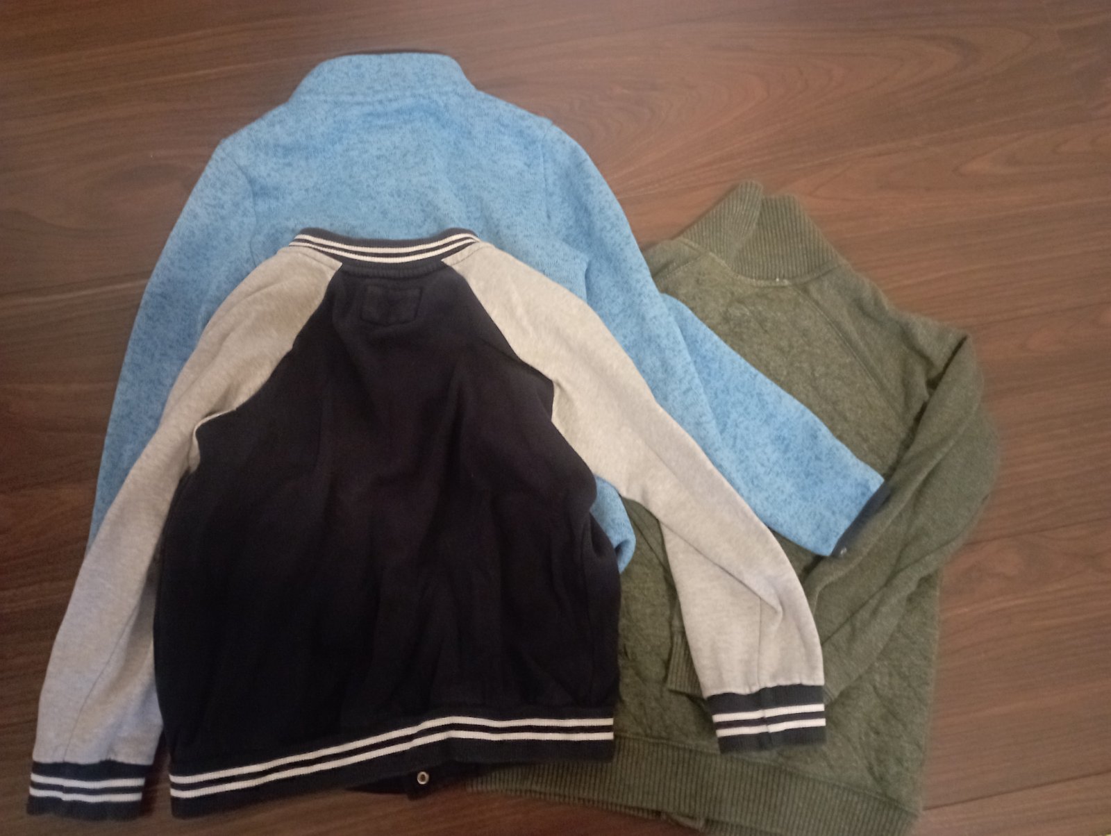 Predám tieto tri mikiny / svetre po mojom synovi. Svetlo modrá ja značky Tchibo, jedine na bežci má rozstrapkany koniec. Zelená značky f&f má malu dierku, odfotila som . Sivá s tmavými rukávmi je tiež značky tchibo. Cena je za všetky spolu ale v prípade záujmu len o jednu predám samostatne.
