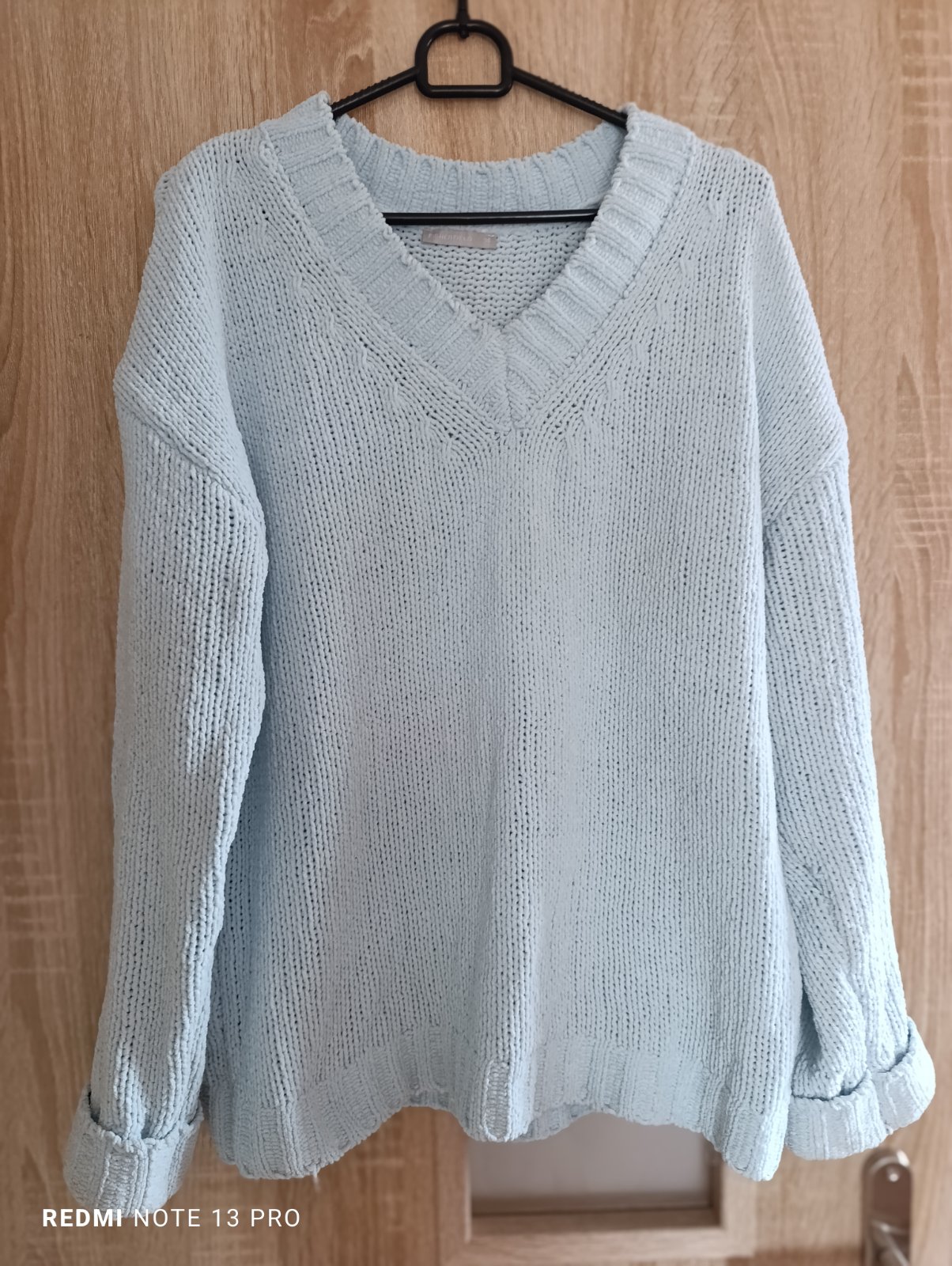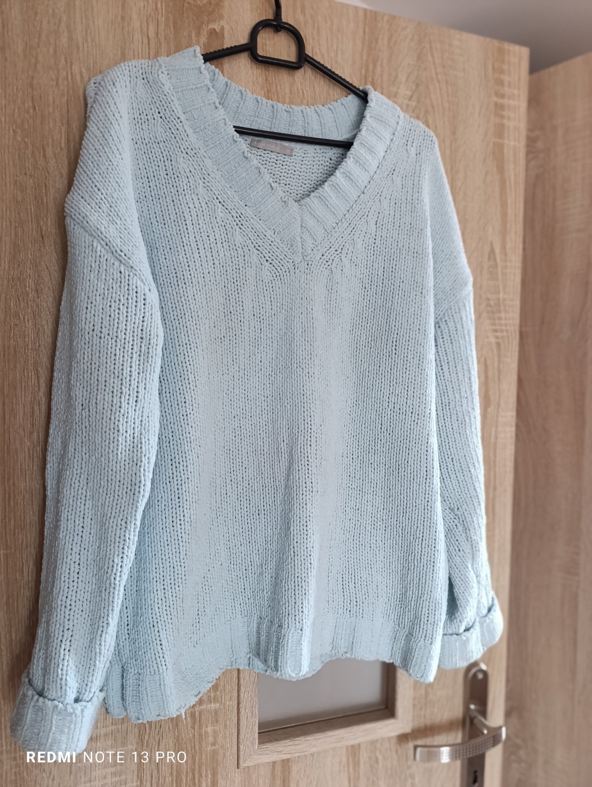 Belasý mäkkučký pulóver, veľmi príjemný materiál. Voľný strih, sedí na S-L. Uvedená veľkosť 36. Pár krát oblečený, super stav. Pri výmene 5€