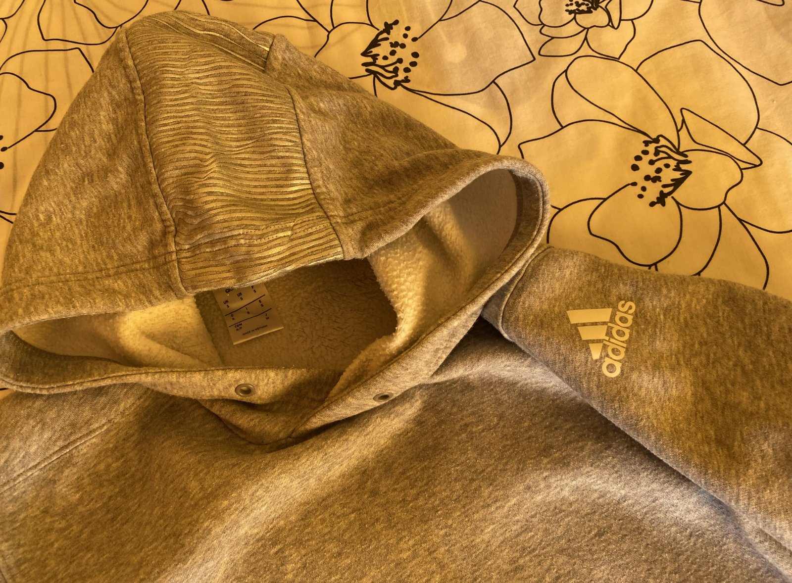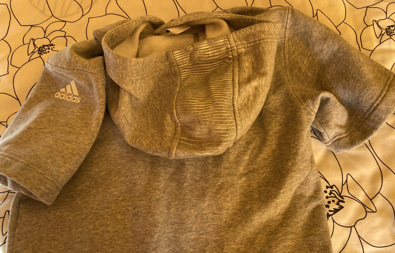 Teplá mikina Adidas krátky rukáv v. S -, kvalitne prepracovaná, kopa pekných detailov - nafotila som aj zloženie materiálu, pekná svetlošedá farba - melír, málo nosená na striedačku s inými. Miery: dĺžka od krku - kapucky dolu: 66cm, šírka: 48cmx2.