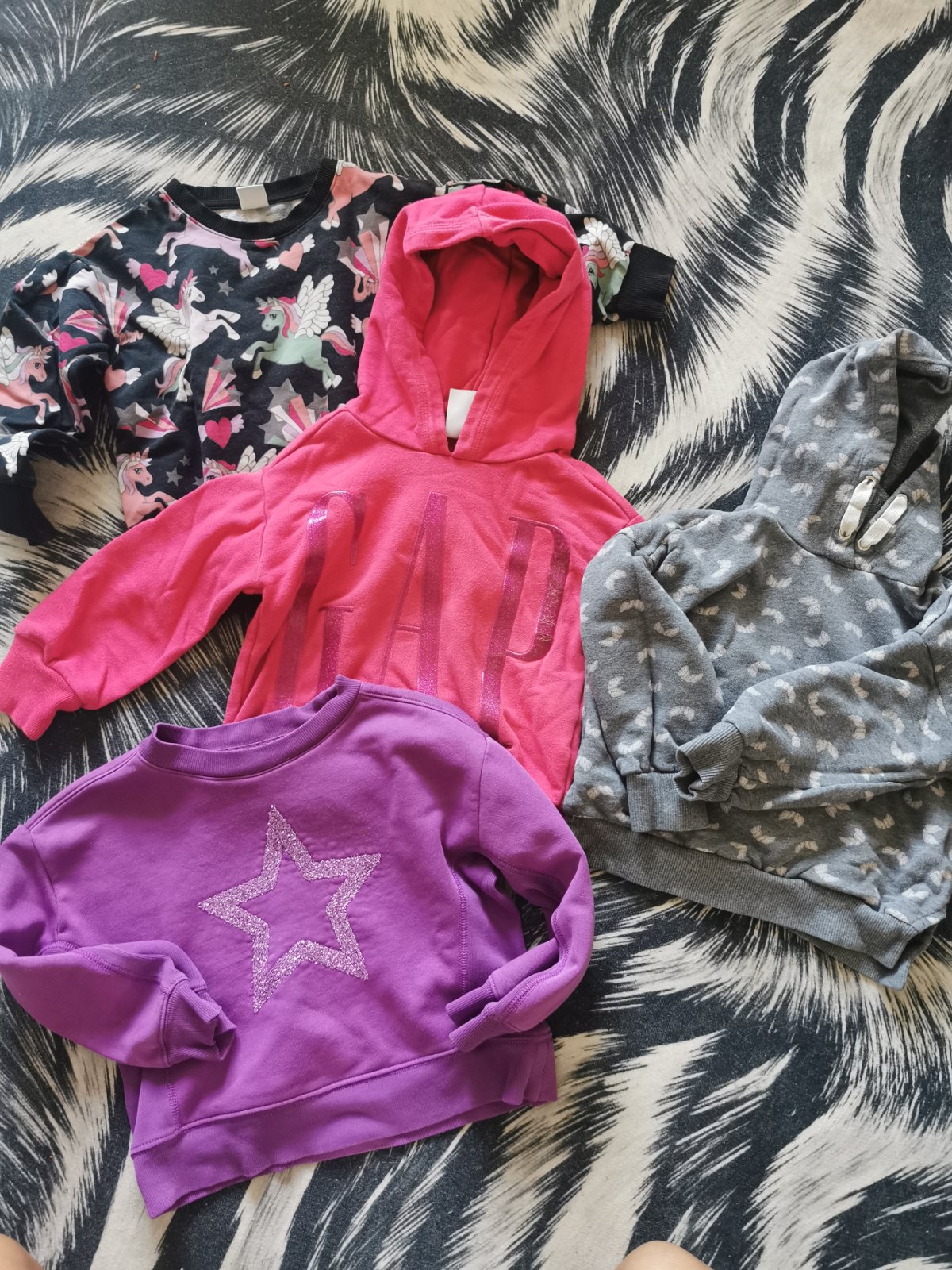 Benetton je seda s kapunou predana , lindex je s jednorozcami-predana, gap mikinky kazda 3e..super stav, iba koralova ma puknute pismeno p.