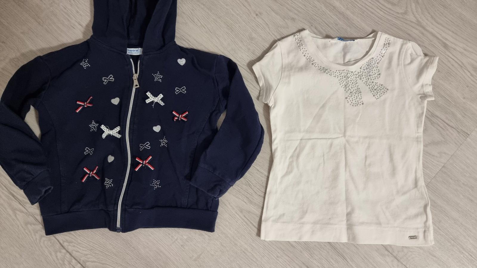 Predám mikinku a tričko mayoral v peknom nosenom stave bez poškodení, mikinka 8€, tričko 4€. Alebo spolu 10€