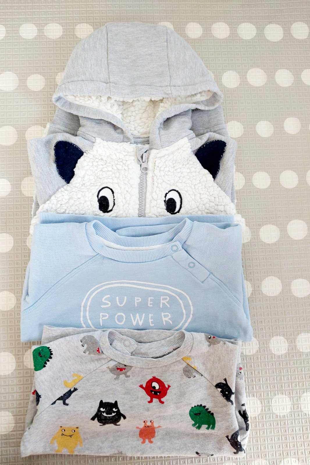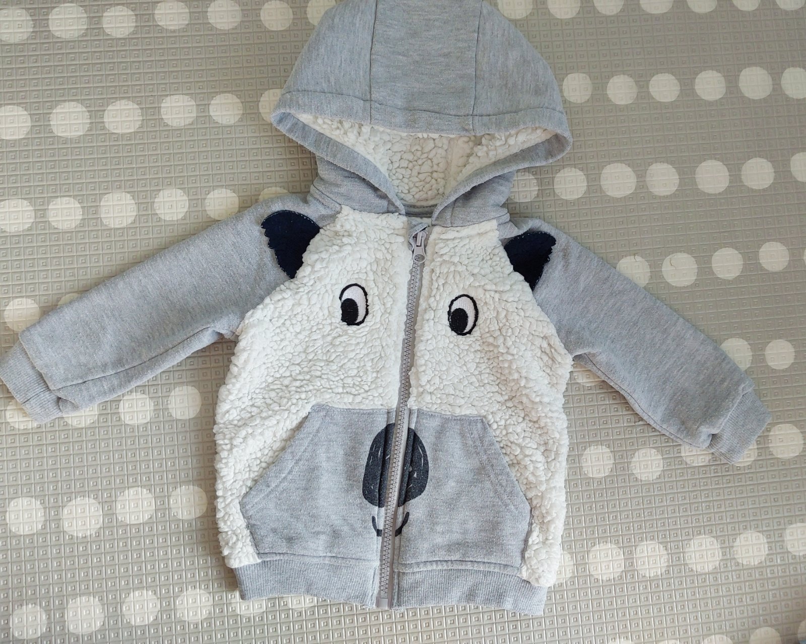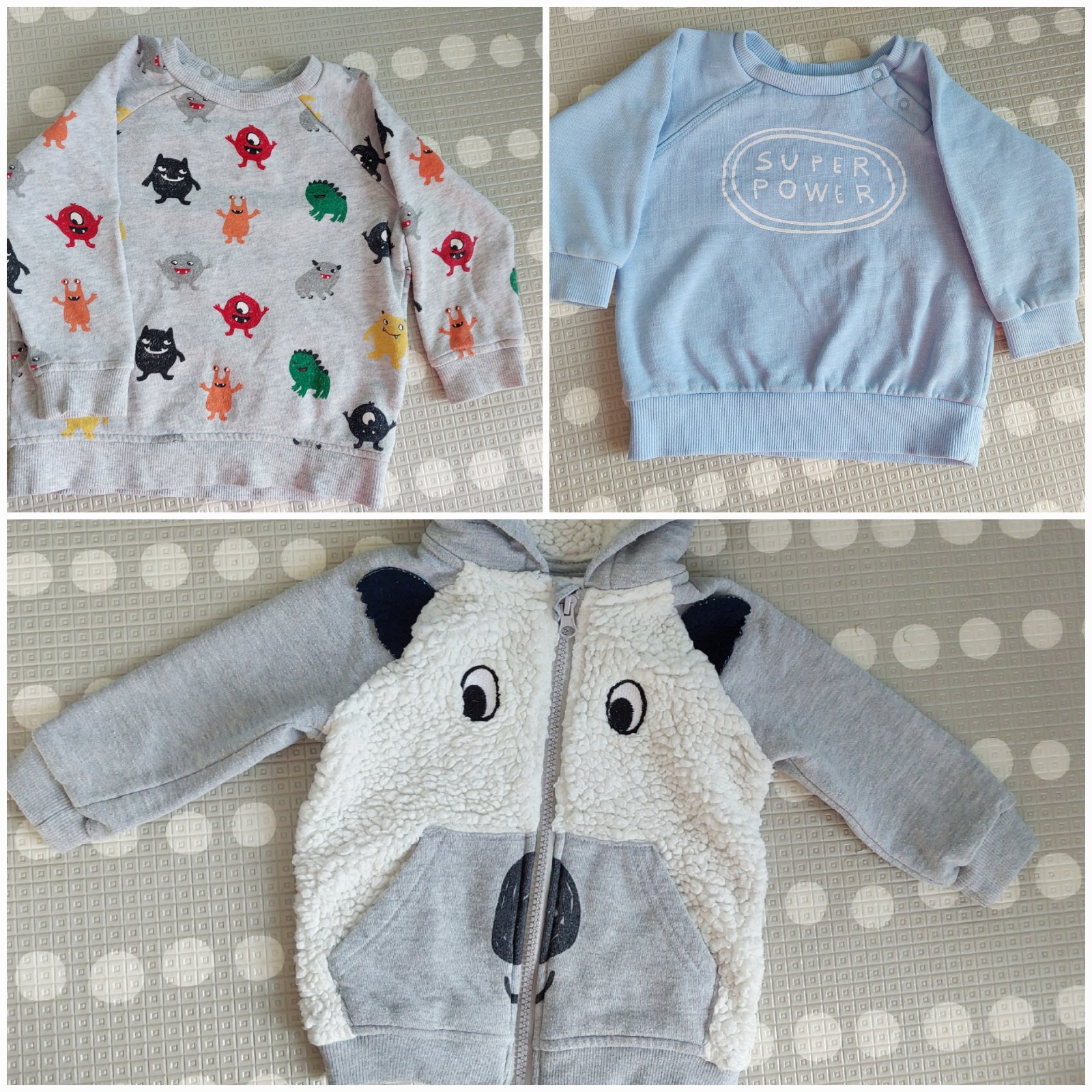 2 kusy svetríkov cez hlavu, zapínanie na patenty ( H&M, Reserverd ). 1 mikinka s kapucňou na zips ( Pepco ). Všetko je veľkosť 80. Bezchybný stav.
