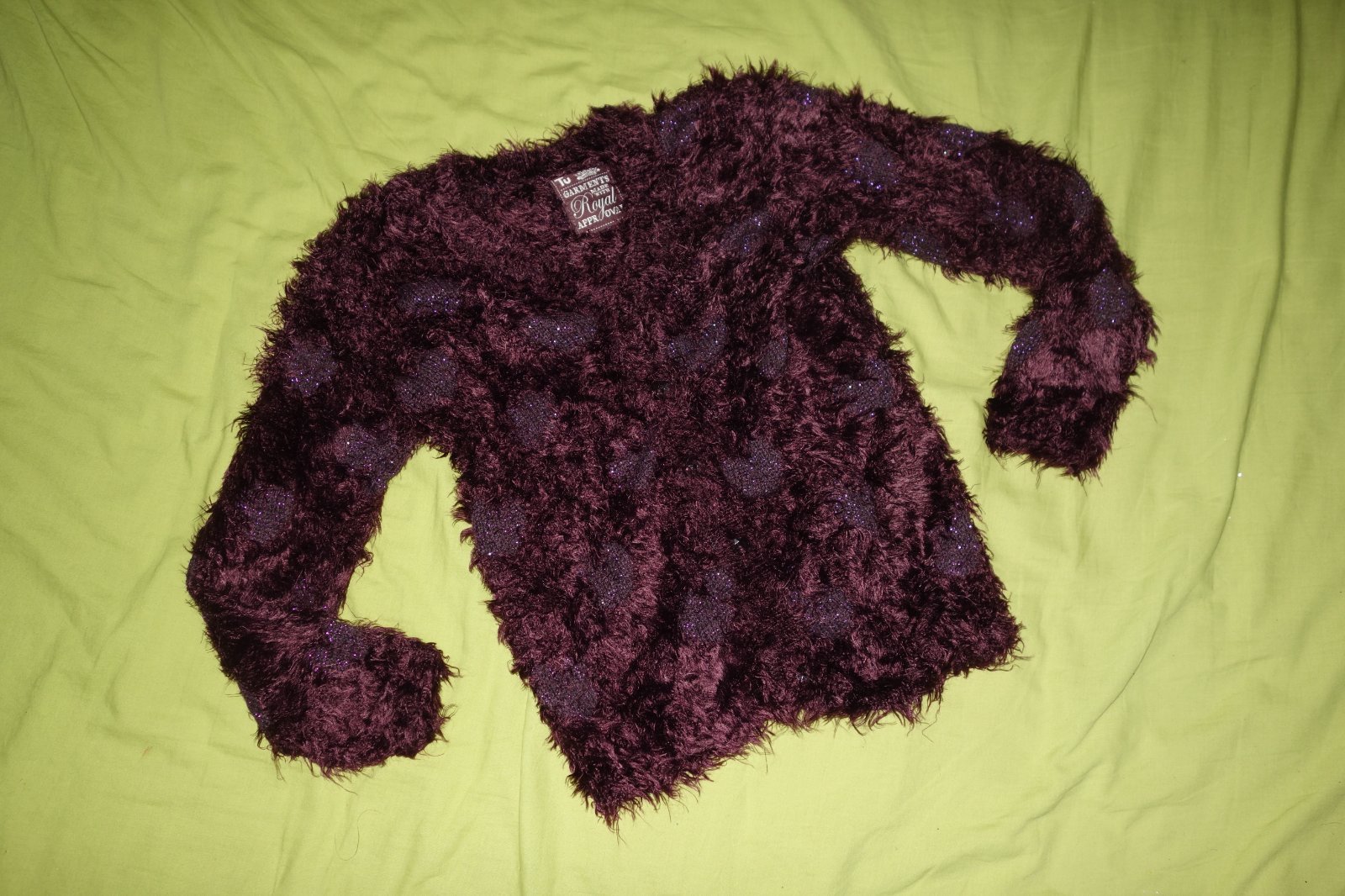 Krasny chlpaty svetricek so srdieckovym vzorom vo velmi dobrom stave.