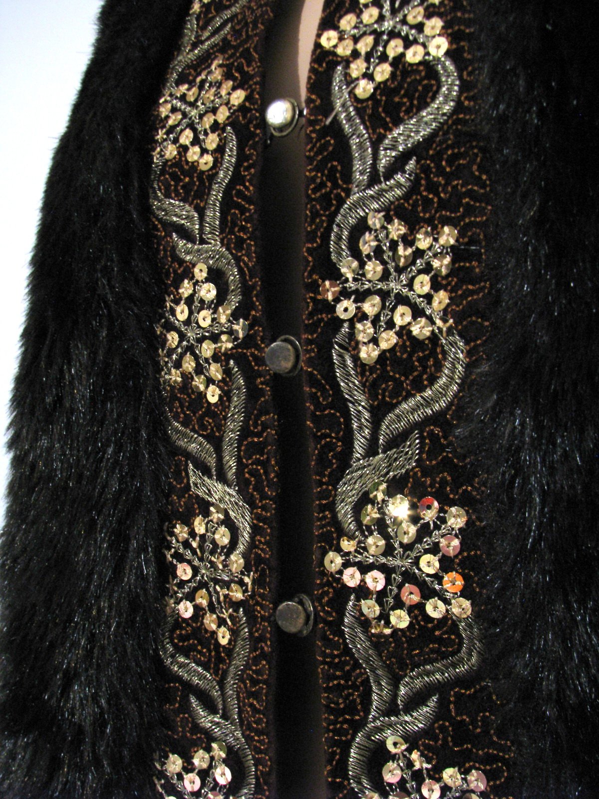 Pekná tmavohnedá vestička z umelej kožušiny, vpredu s výšivkou a zlatými flitrami. Výborne zachovalá, bez poškodení. Veľkosť odhadom M - L, figurína je S. V prípade záujmu premeriam.