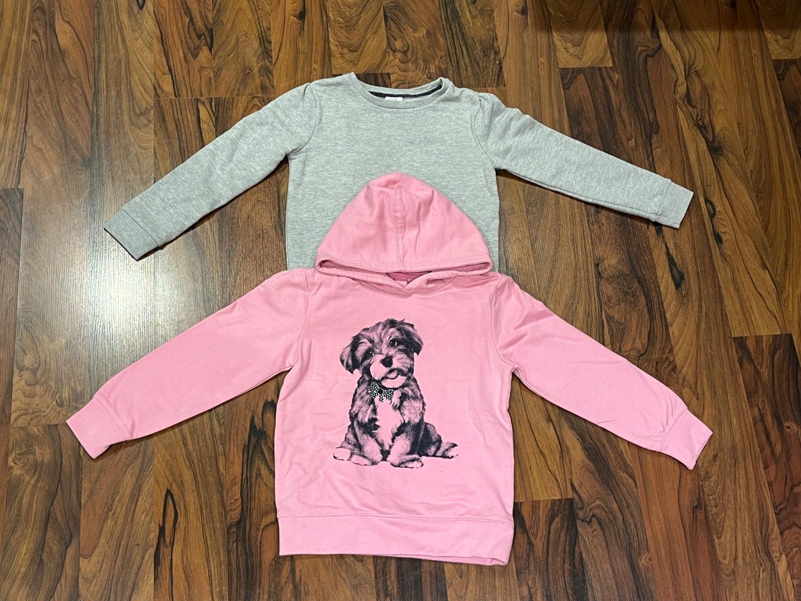 Predám 2 mikiny, ružová so psikom je DopoDopo 110/116, top stav, 2,50€. Sivo-strieborná je F&F velkost 116, ale su rovnaké velkostne, top stav, je akoby trblietava- strieborná, cena 2,50€.