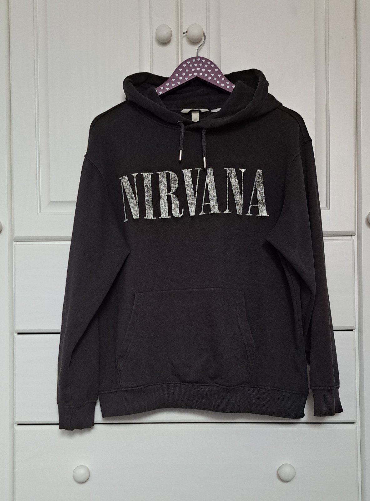 dámska tmavo sivá mikina klokanka, kapucňa, klokanie vrecko, príjemný kvalitný materiál, zloženie: bavlna, polyester, stav: dobrý, nosený, žmolky, značka: H&M, uvádzaná veľkosť na štítku 36, zodpo...