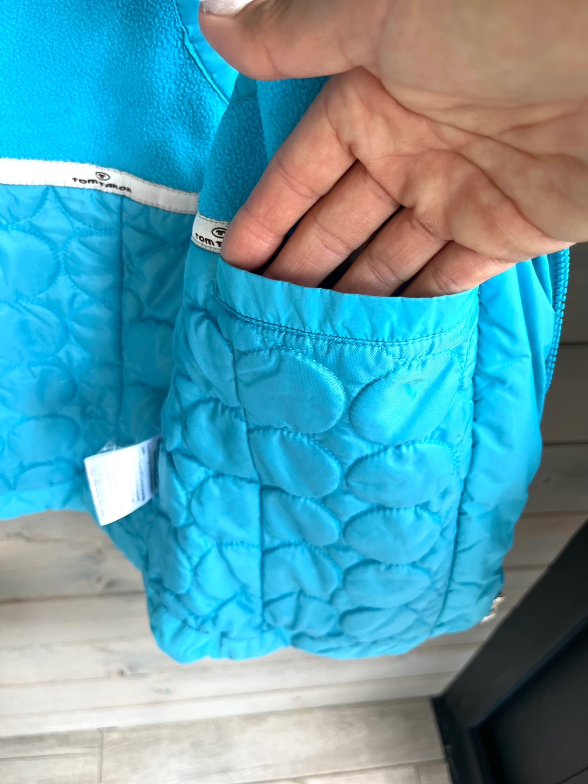 Tyrkysová pekná vesta s roláčikom. Na prednom diely vzor