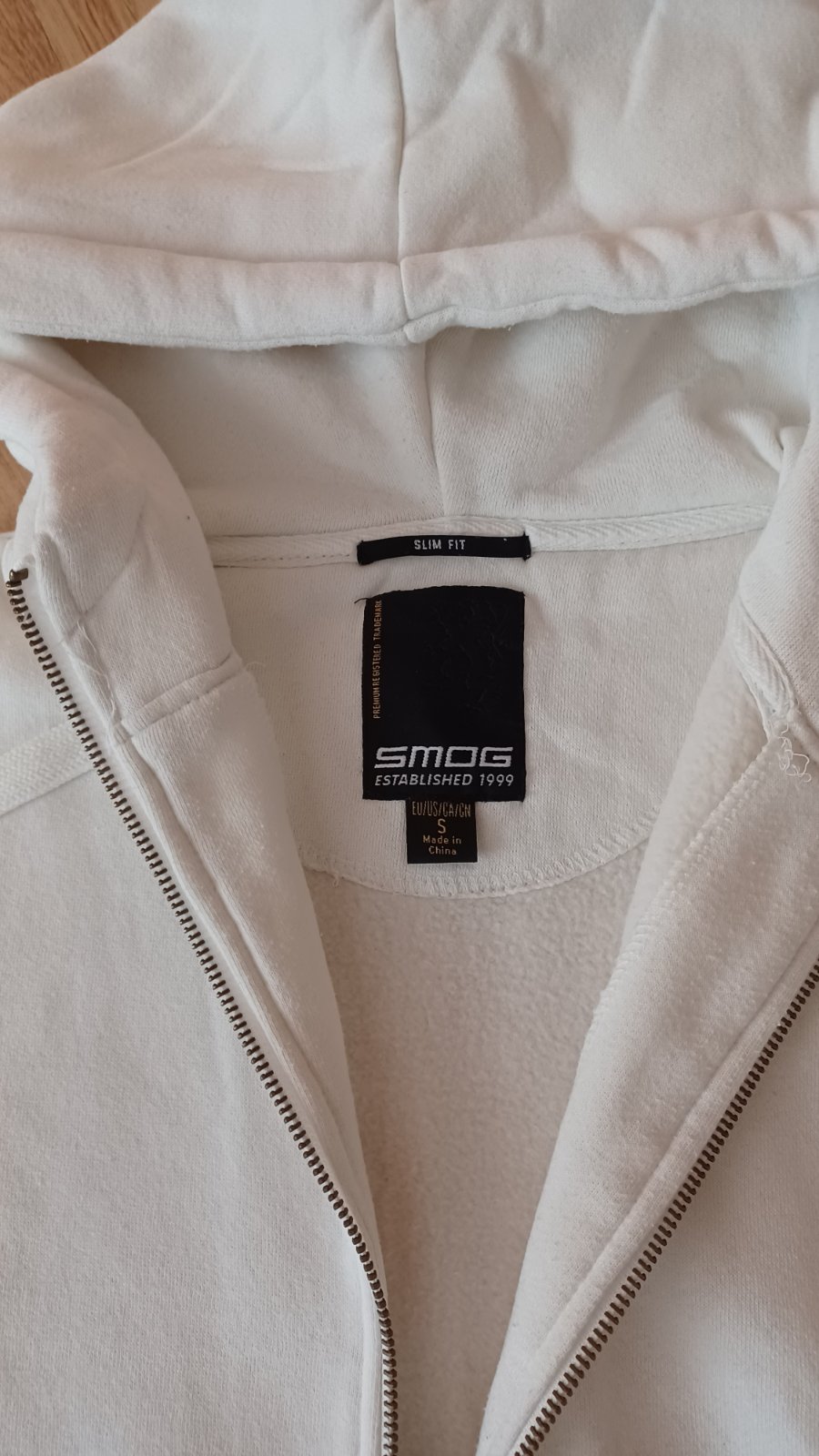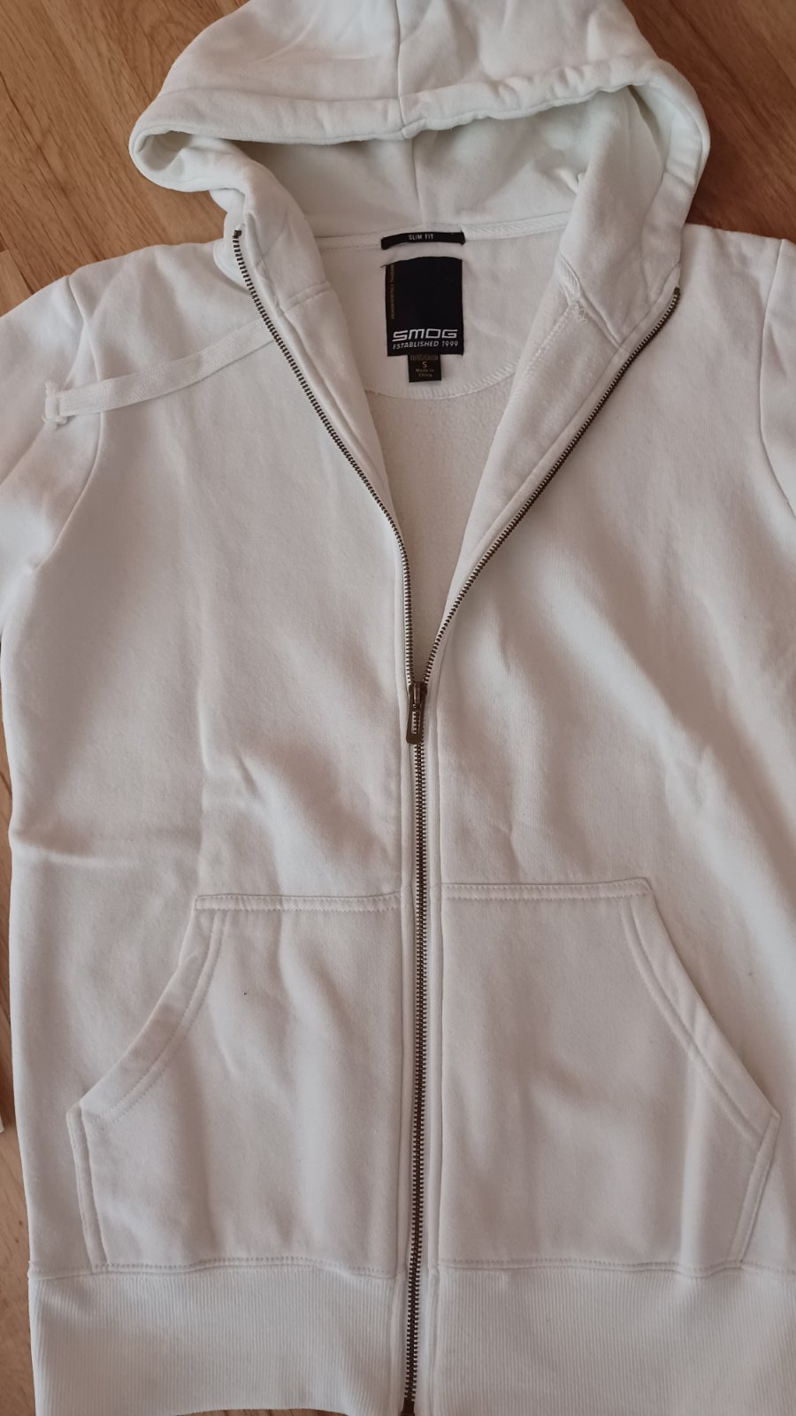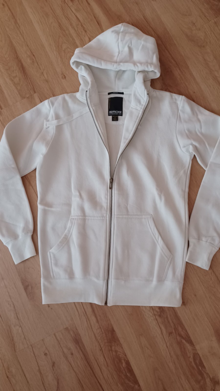 Predám pánsku mikinu vel.S zn.SMOG len na chrbte sú malé fliačiky nie je to vidieť./Posledná fotka/Dĺžka:67cm,šírka cez prsia:52cm.