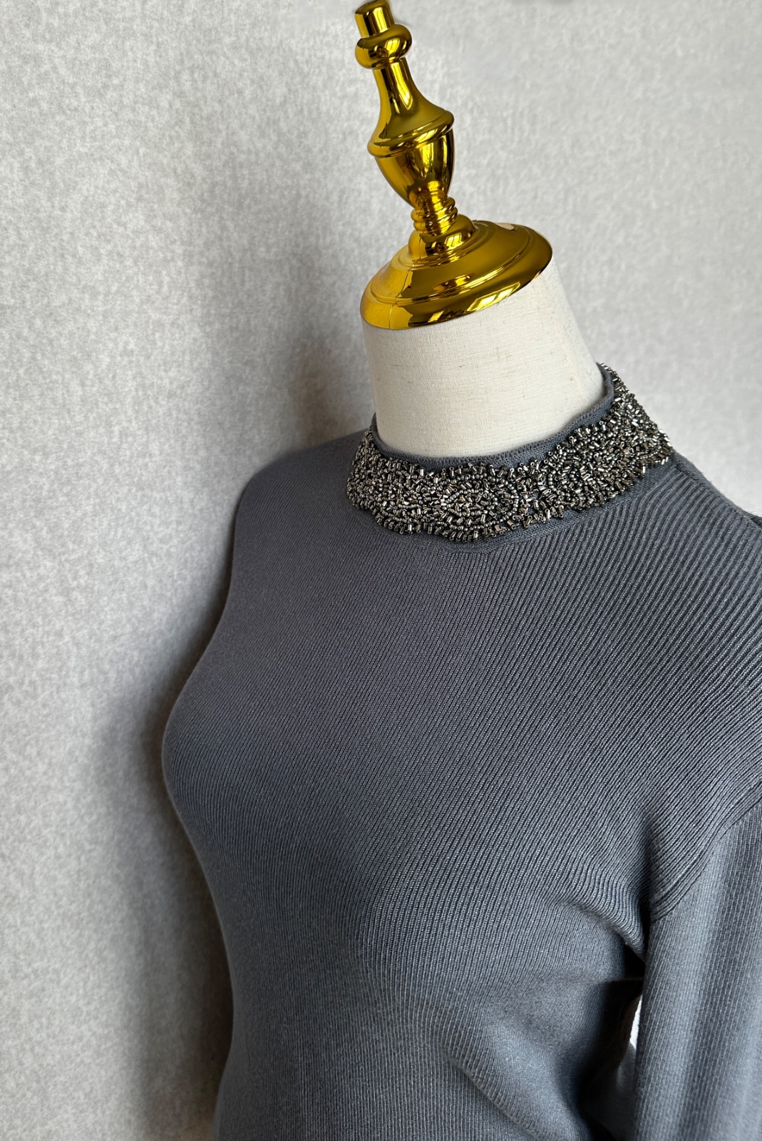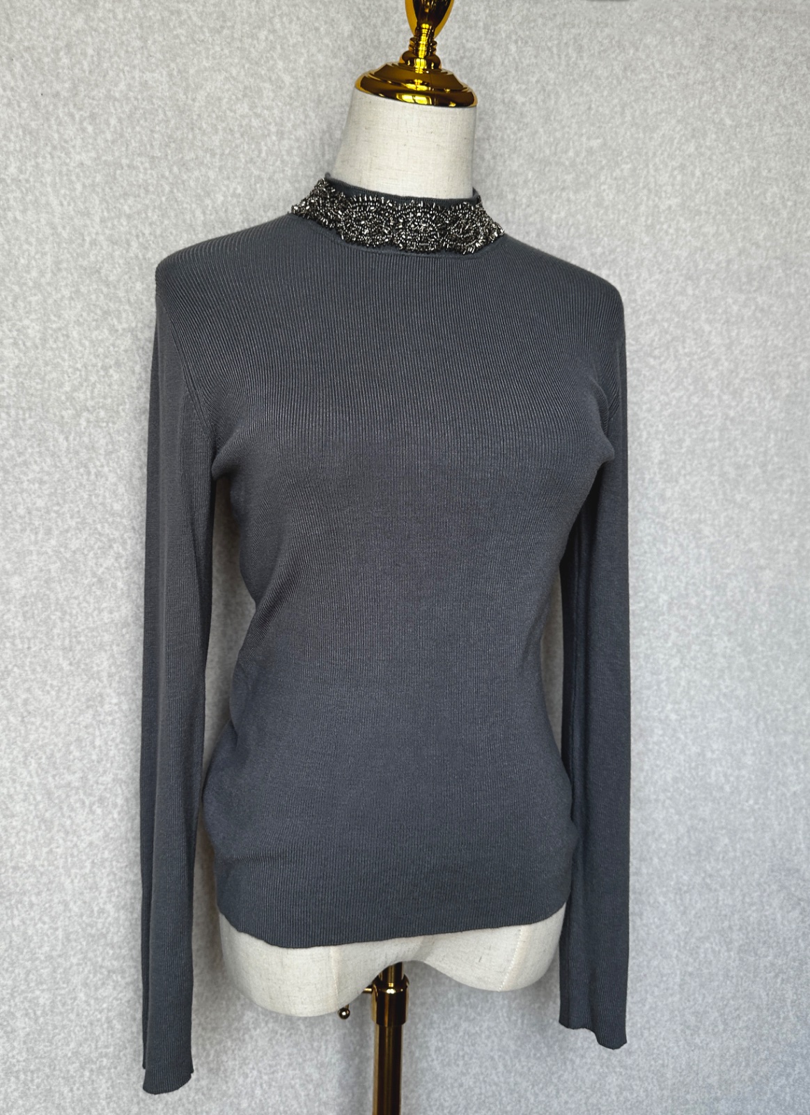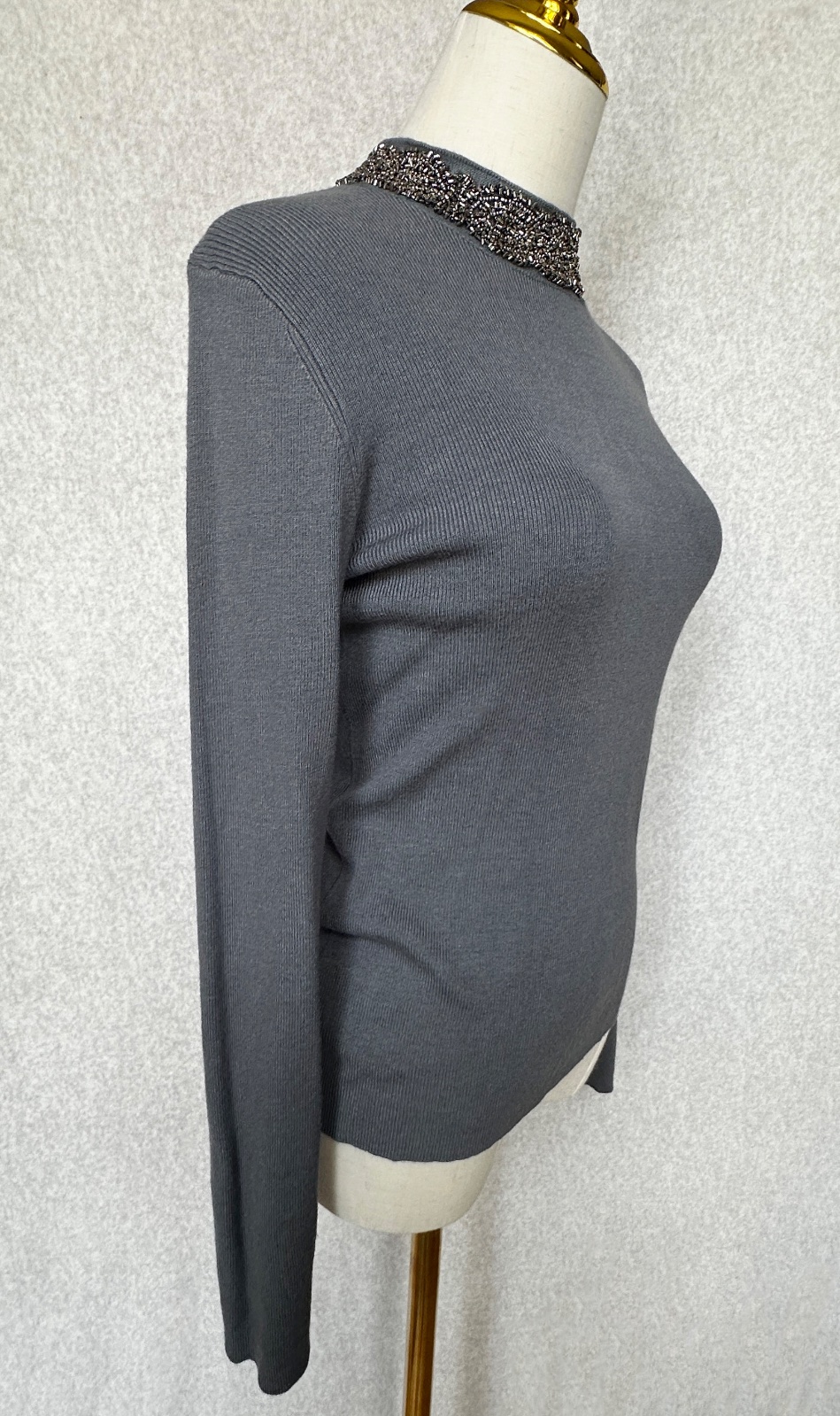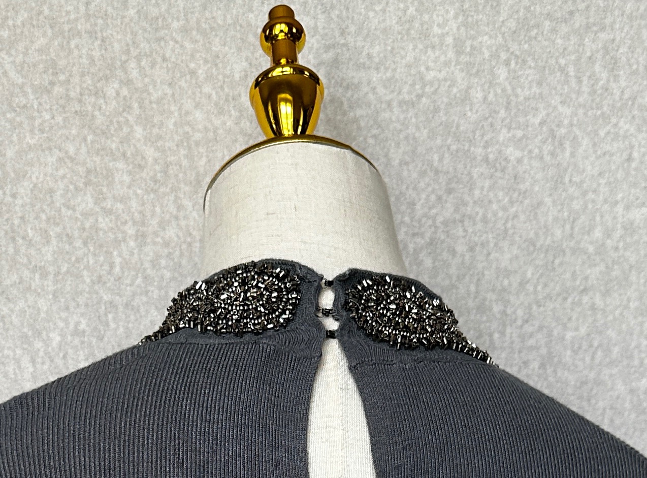Luxusný pulóver s vyšívanými gorálikmi okolo krku. Zapínanie vzadu na krku. Extra hebký poddajný úpletový materiál - nežmolkavie sa. V super stave, bez poškodení.