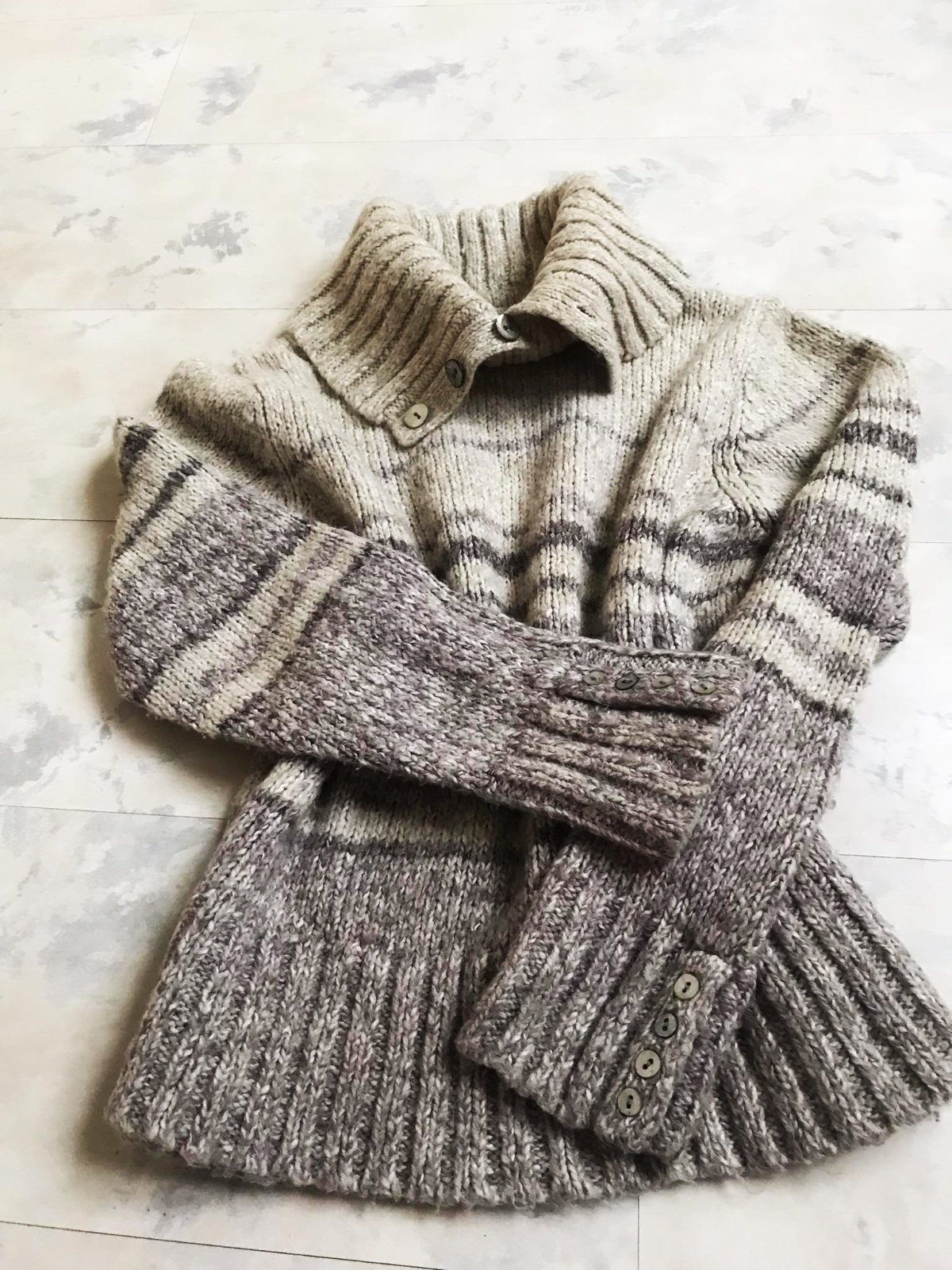 zaujímavý a teplý hrubší striekaný pulóvrik,variabilný golier,ktorý sa dá rozopnúť, perleťové gombíky,má jemné žmolky - tak,ako na všetkých akrylových svetroch sa urobia žmolky aj po 2 praniach,materiál vyfotený