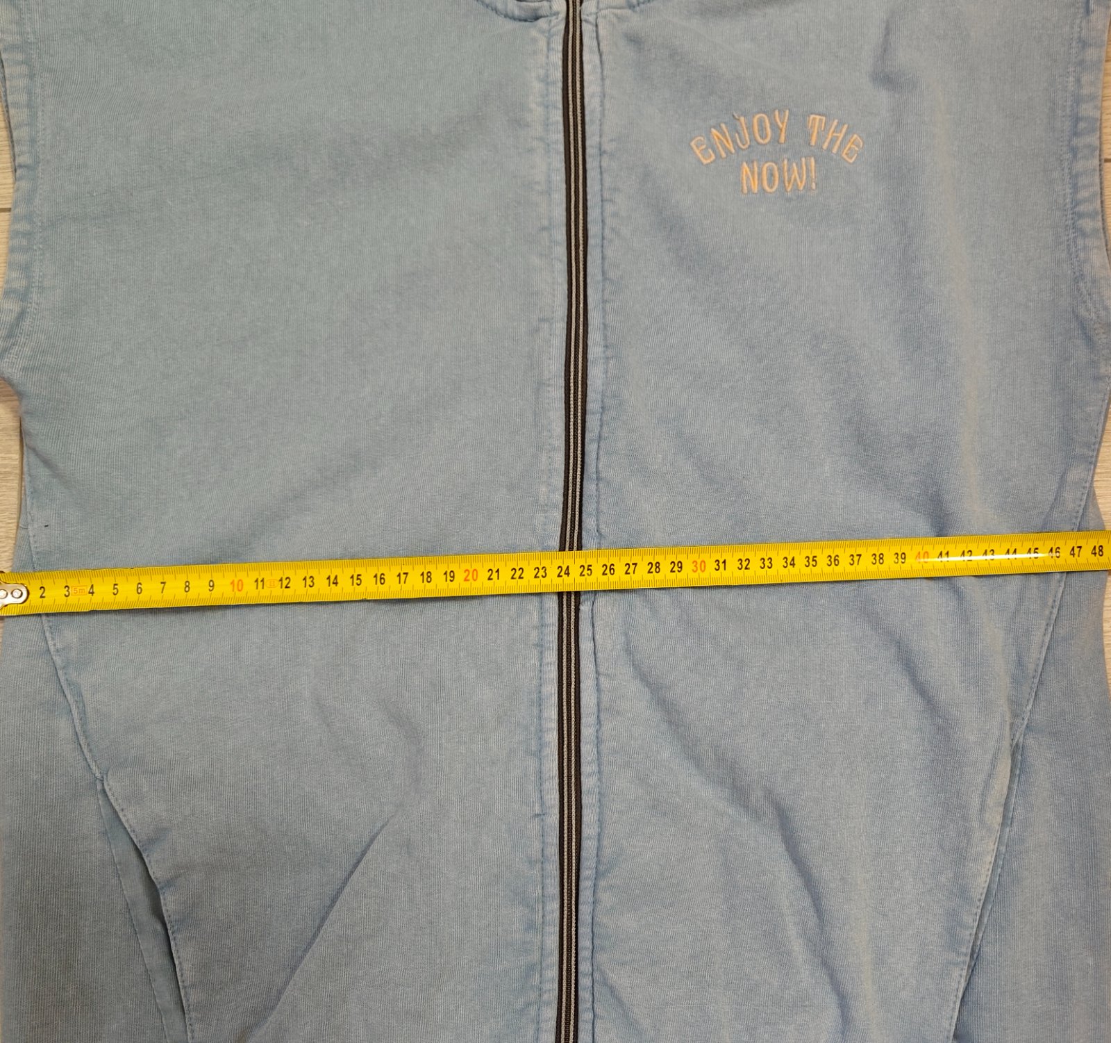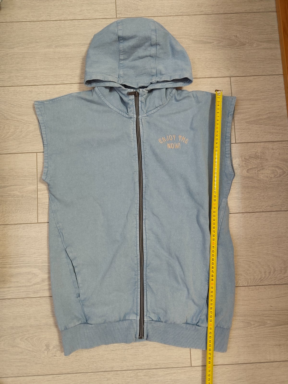 Tenka bavlnena vesta s kapuckou so zapinanim na zips a s bocnymi vreckami.