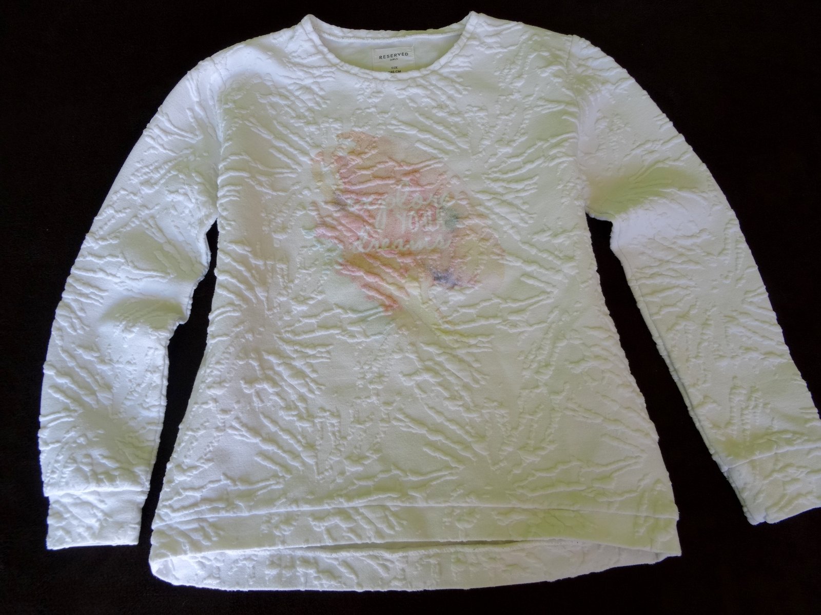 1/ Biela mikinka, pulóver zn. Reserved, veľ.146, rozmery: dlžka predného dielu 52cm, zadný má 55cm. Pod pazuchami 2x44cm, rukáv 49/40cm.