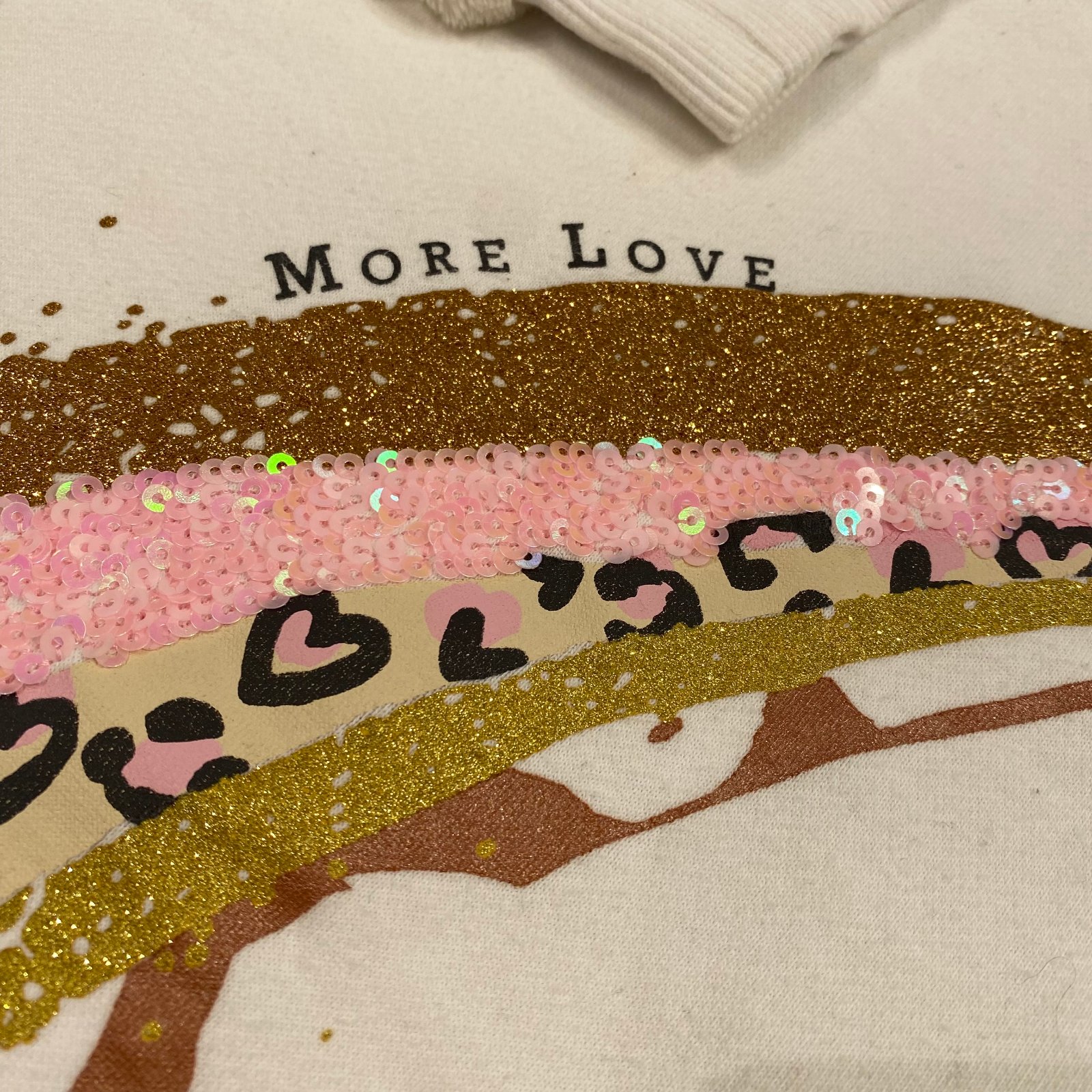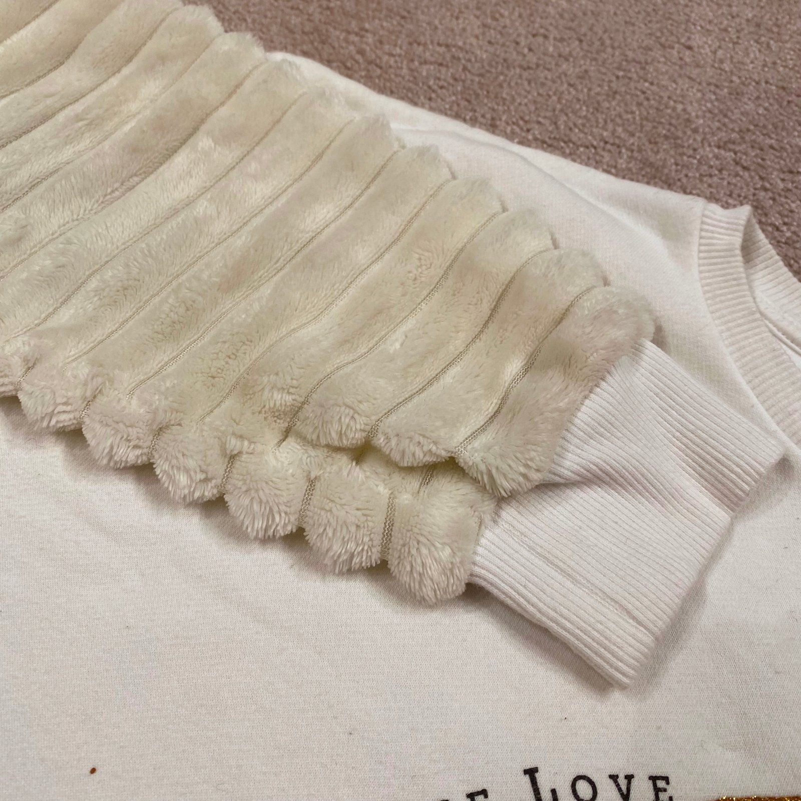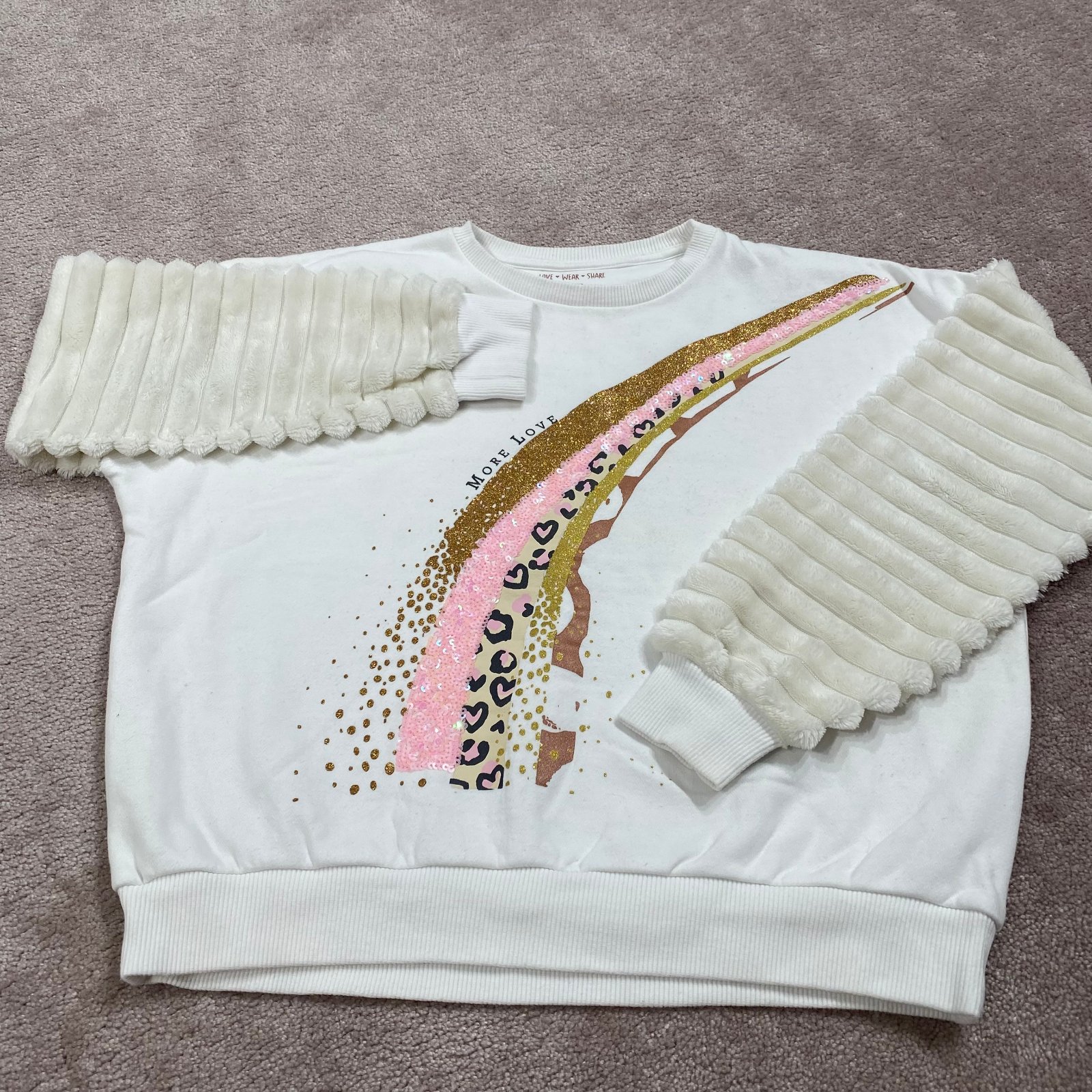 Biela teplejšia mikina s farebnou aplikáciou, s kožušinovými rukávmi. Dĺžka je 51 cm, šírka je 53 cm, dĺžka rukáva od krku 63cm. Nepoškodená v dobrom stave.