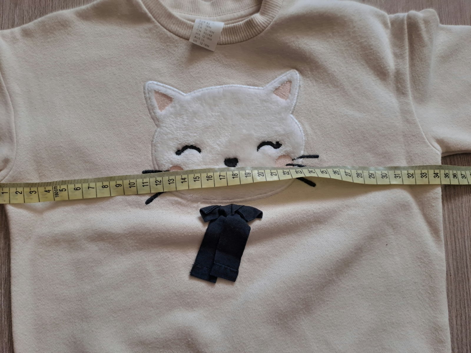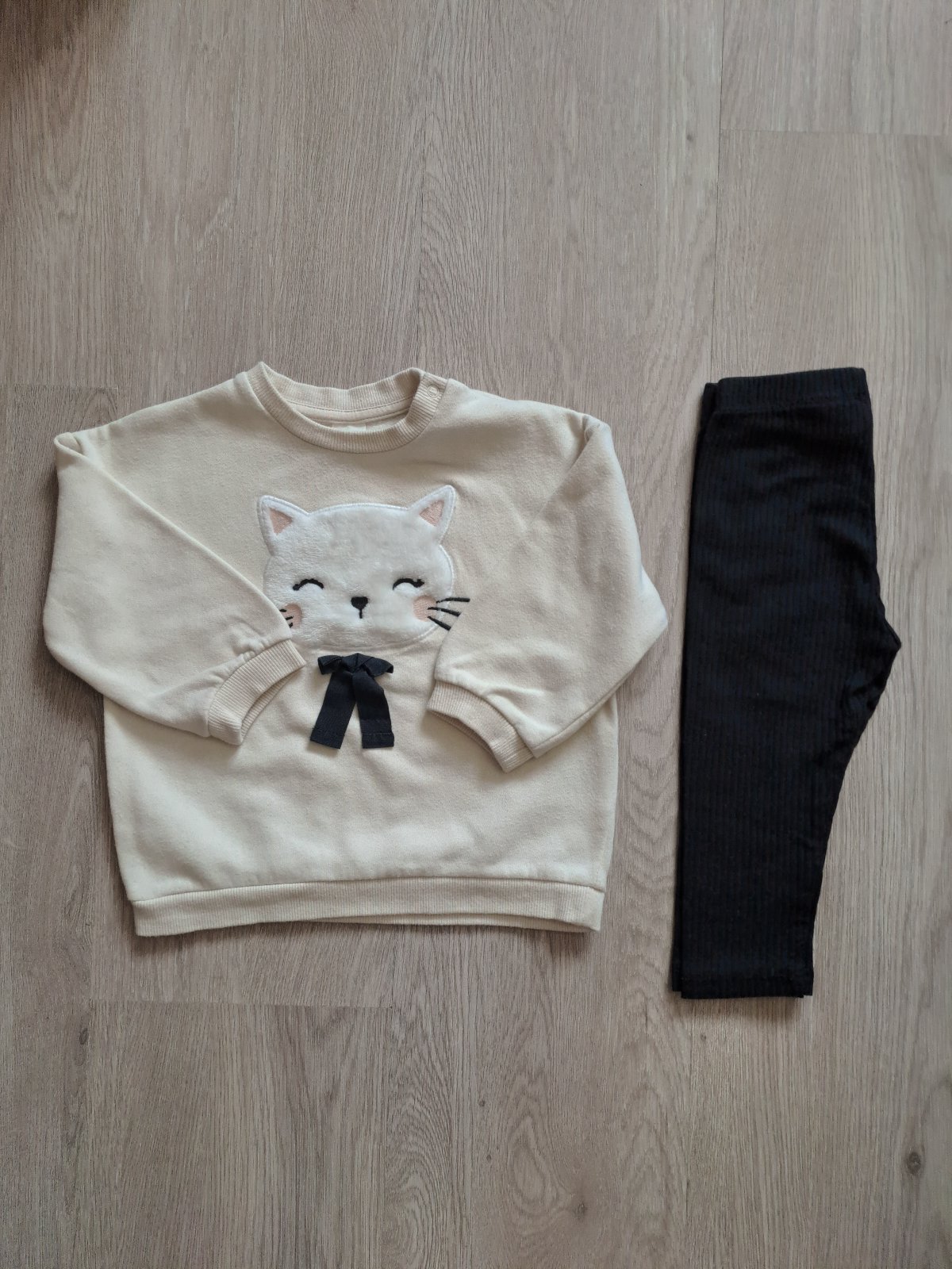 Suprava zateplenej mikiny (cesane vnutro, zapinanie pri krku, motiv roztomila plysova macicka) a cierne leginky. Top stav, nosene ako sviatocne. Rozmery vid foto. Kuk aj dalsiu ponuku v danej velkosti.