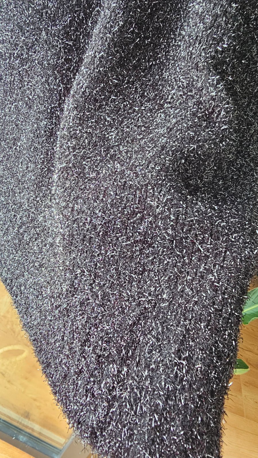 Je celý cierny, aj tie trblietavé časti su čierne hoci na foto vyzerajú mozno ako strieborne. Pise sa velkost S ale je ovela väčší preto píšem L.